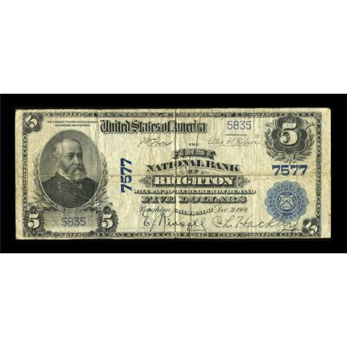 <B>Brighton, CO</B></I> - $5 1902 Plain Back Fr. 598 <B>The First NB</B></I> Ch. # 7577<BR> A just plain scarce Denver area bank which was the sole issuer in this then rural community. Just $910 was outstanding in large notes at the time this bank went under in 1931, and we note only one offering from here of any kind since 1996. Pen signed <B>About Fine.</B></I><BR><BR><b>Shipping:</b> Coins & Currency (<a target="_blank" href="http://www.heritageauctions.com/common/shipping.php">view shipping information</a>)