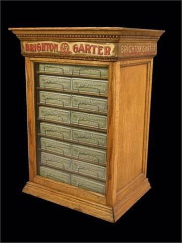 Brighton Garter Store Display Case. Oak with Copies of Original Packaging. 19x14x10. Excellent Condition. Appears to be Missing Side Stencils.