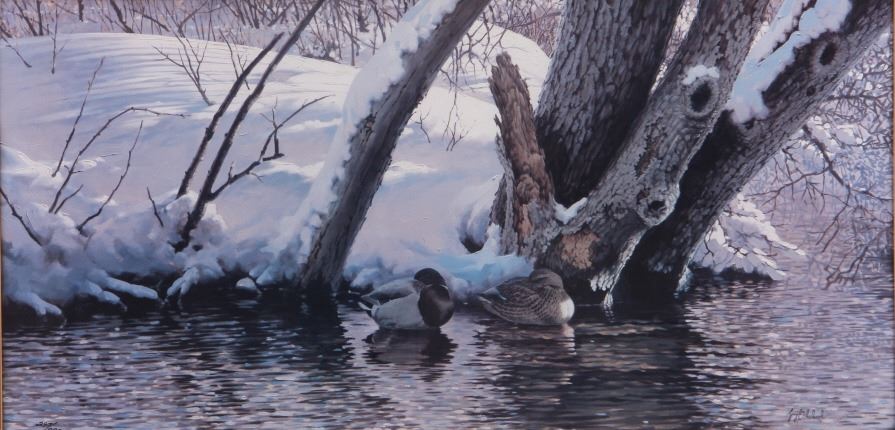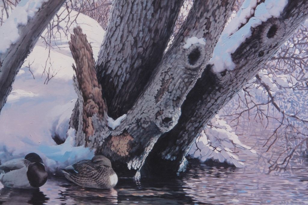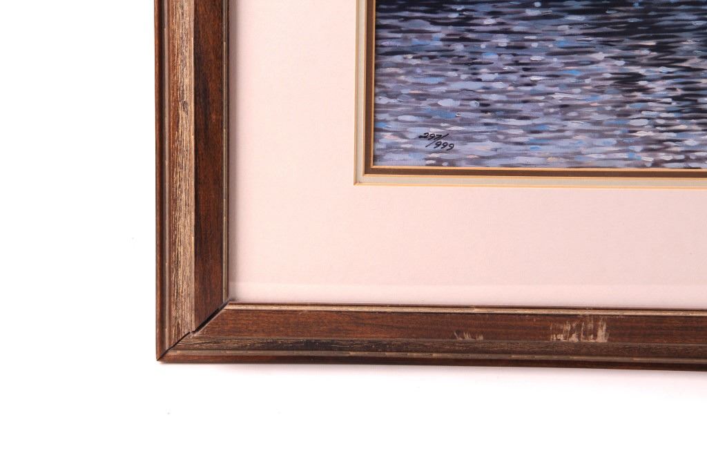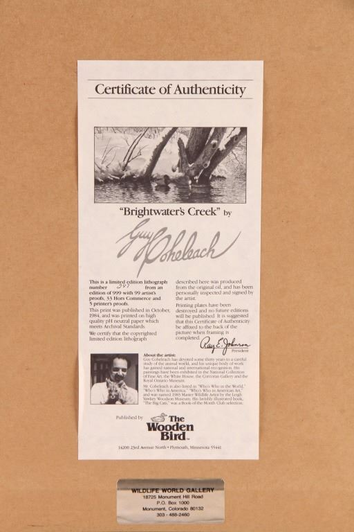 For your consideration is this lithograph, titled "Brightwater's Creek", by Guy Coheleach. The lithograph shows a winter scene with two waterfowl bathing by the bankside. The artist’s signature is in the bottom right-hand corner. There is a certificate of authenticity attached to the back of the framed lithograph. Guy Coheleach is an American wildlife artist. From 1991 to 2011, his paintings were displayed in 41 one-man retrospective exhibitions in well-known museums in 36 cities, from New York to Los Angeles. The condition of this framed lithograph is good, with no obvious signs of damage to the lithograph; however, the frame shows some wear and scuff to the bottom part of the frame. The measurements of this framed lithograph are 24 1/4" x 38 3/4"; the visible art measures 14" x 28 3/4".