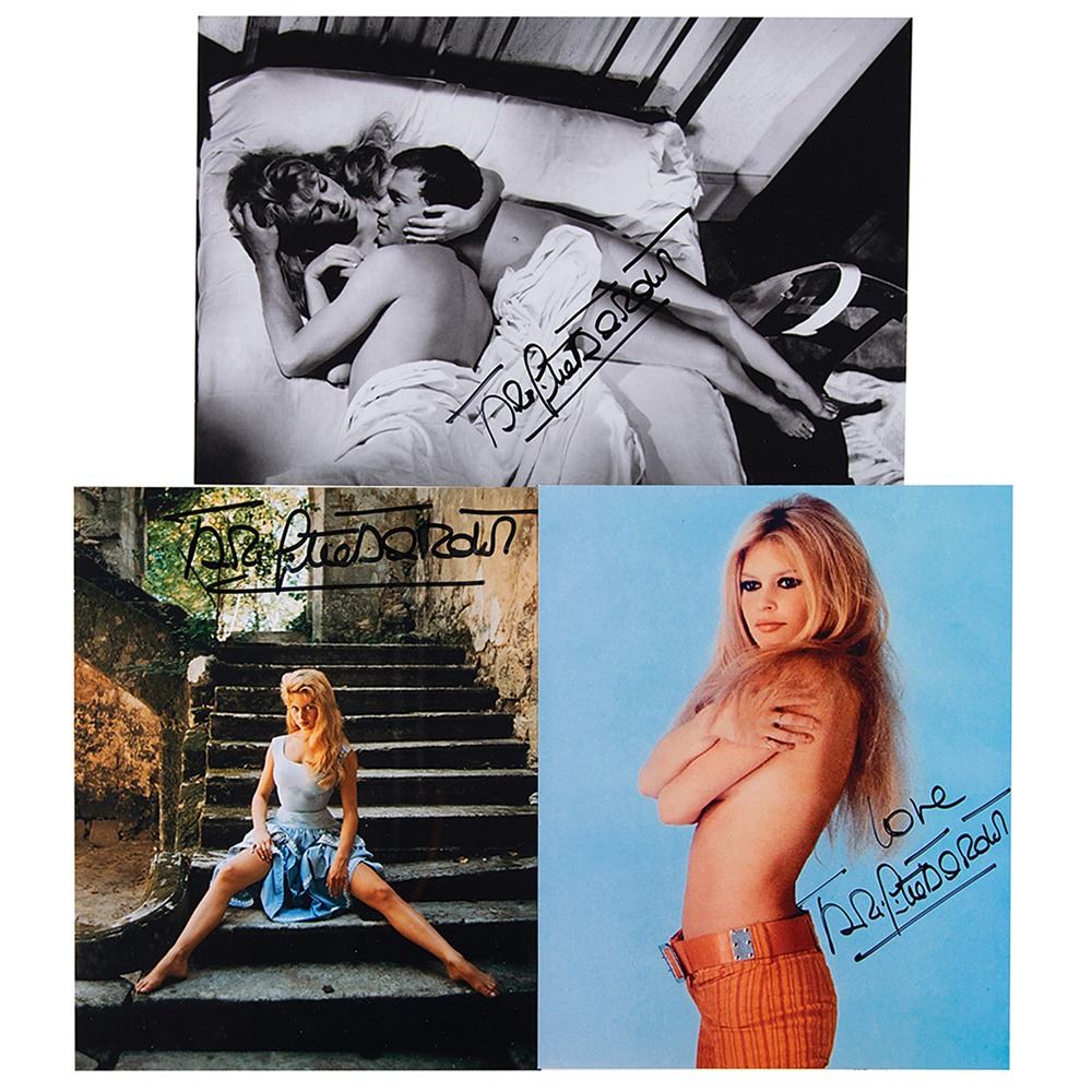 Three different glossy photos of the blonde bombshell, ranging in size from 8 x 10 to 12 x 8, each signed in black felt tip by Brigitte Bardot. In overall fine condition.