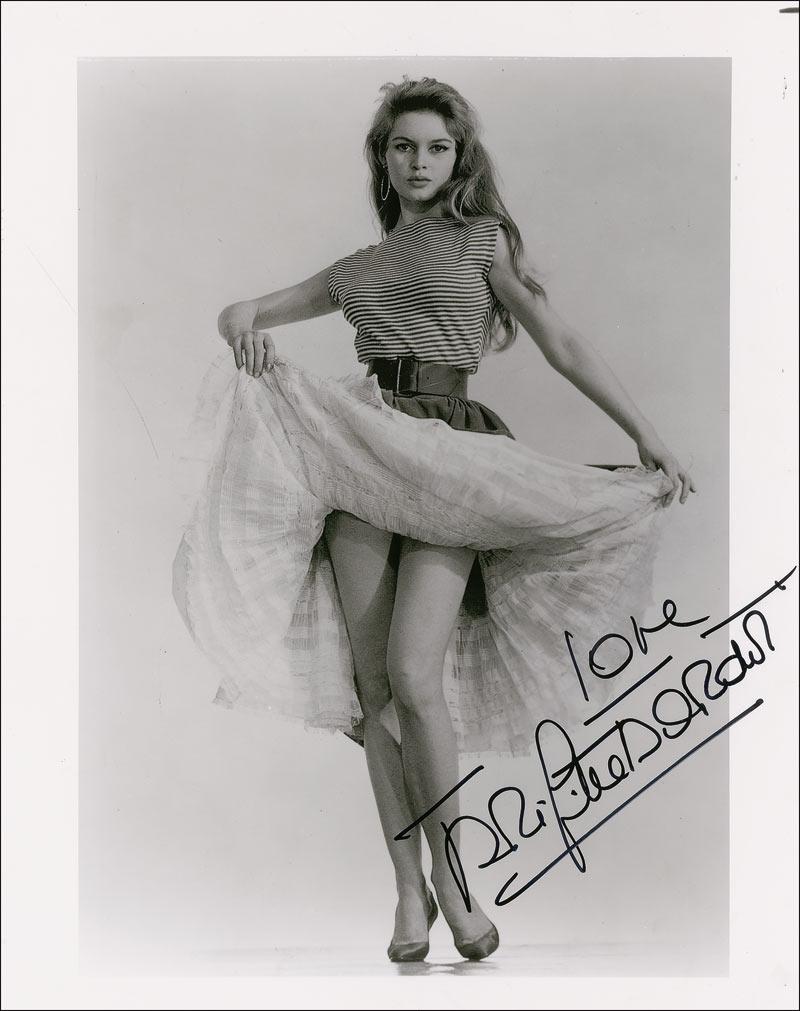 Glossy 8 x 10 photo of the sultry vixen lifting her skirt, signed in black felt tip, “love, Brigitte Bardot.” In fine condition.