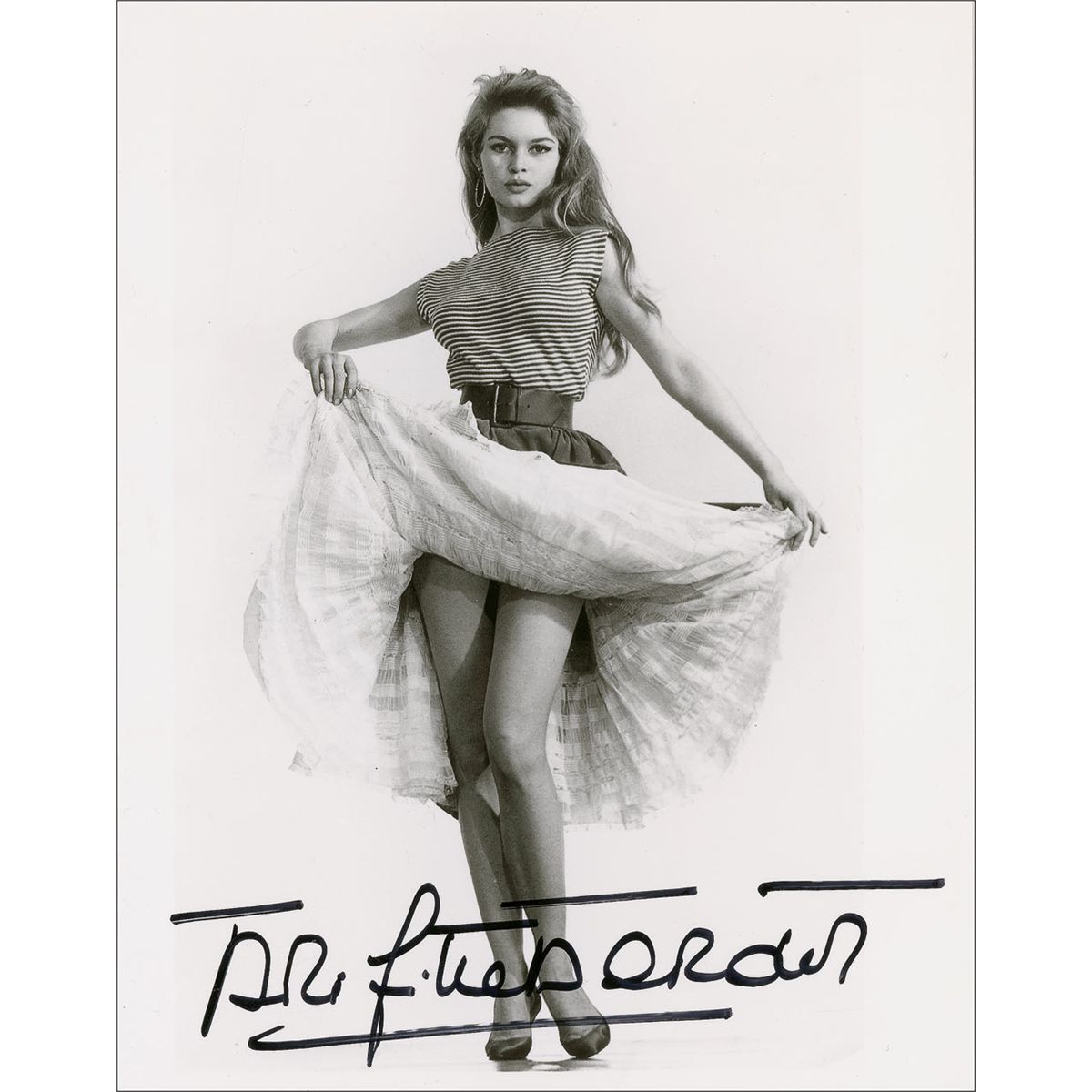 Two different glossy 8 x 10 photos, one featuring the sultry beauty showing some leg and twirling her skirt, and the other highlighting her hour-glass figure in a bathing suit, each boldly signed in black felt tip. In fine condition.