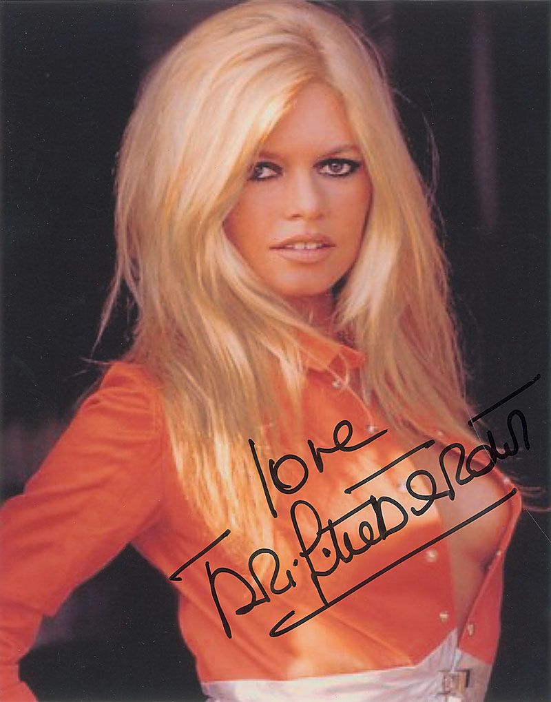 Sexy color glossy 8 x 10 photo of Bardot in an open shirt, signed in black felt tip. In very fine condition.