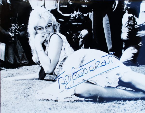 Glossy 14 x 11 photo of Bardot lying on the grass and nibbling on her finger, signed in blue felt tip. In fine condition.