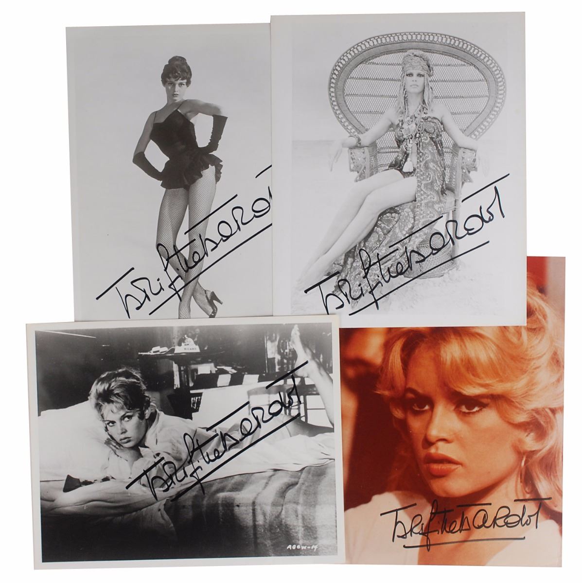 Four attractive glossy and satin-finish photos of Bardot in her prime, approximately 8 x 10 and 10 x 8, each prominently signed in thick black felt tip. In overall fine condition, with some bends and creases to the color photo.