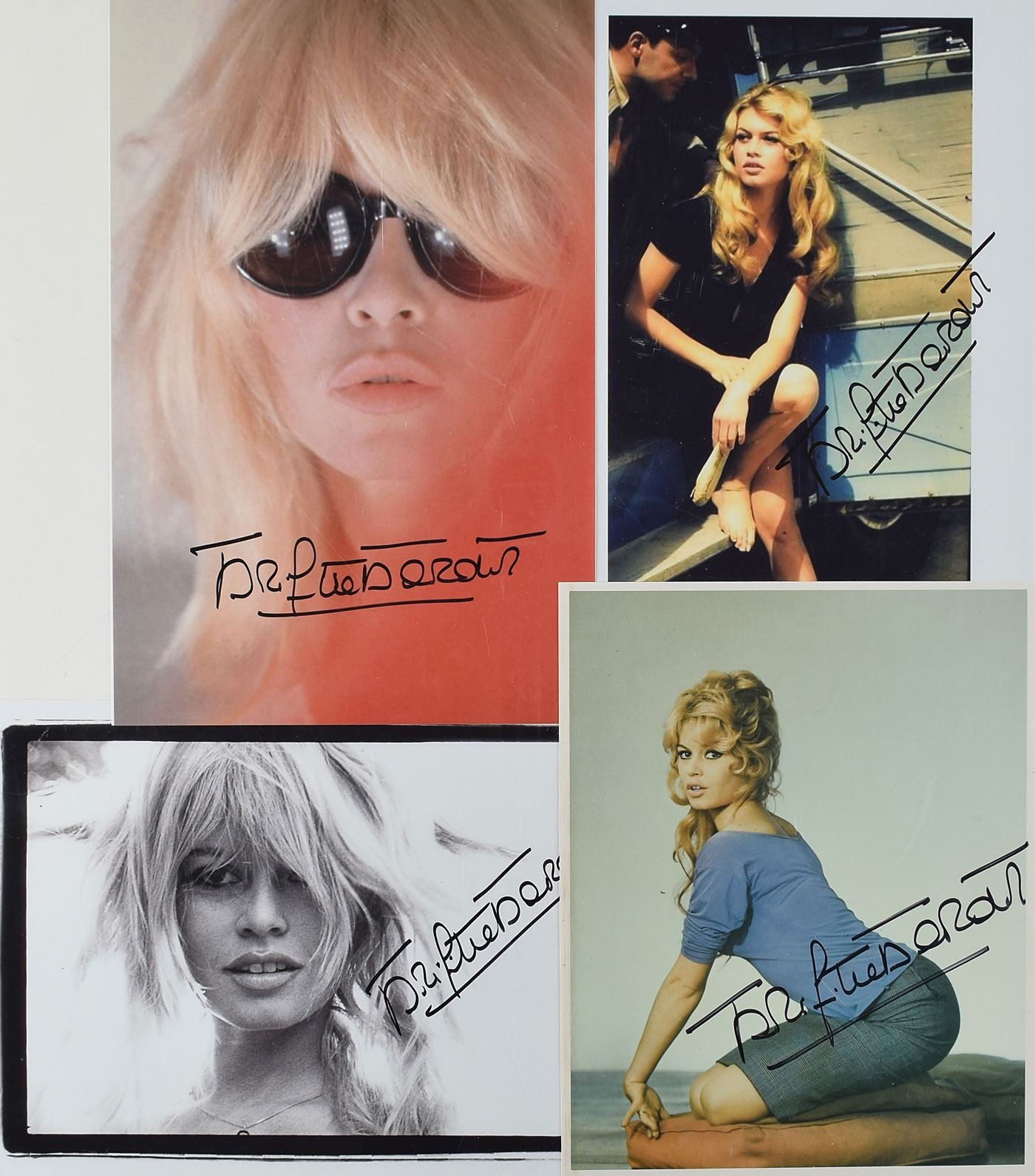Group of four glossy photos of Brigitte Bardot, ranging in size from 8 x 10 to 12 x 8, each signed in black felt tip by the blonde bombshell. In fine condition.