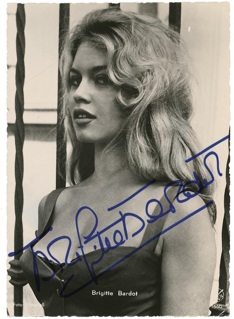 Sultry deckle-edged glossy 4 x 5.75 postcard photo of the sexy Bardot, signed in blue felt tip. In fine condition. Pre-certified PSA/DNA and RRAuction COA.