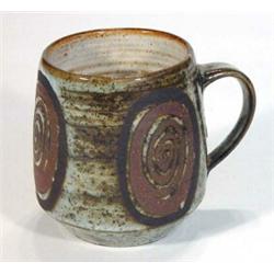 Briglin pottery mug, decorated with a brown abstract pattern, impressed marks to base, 12cm high