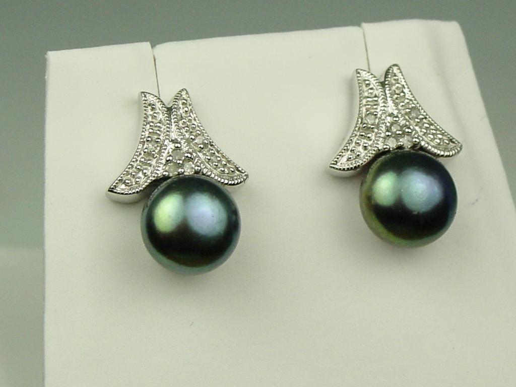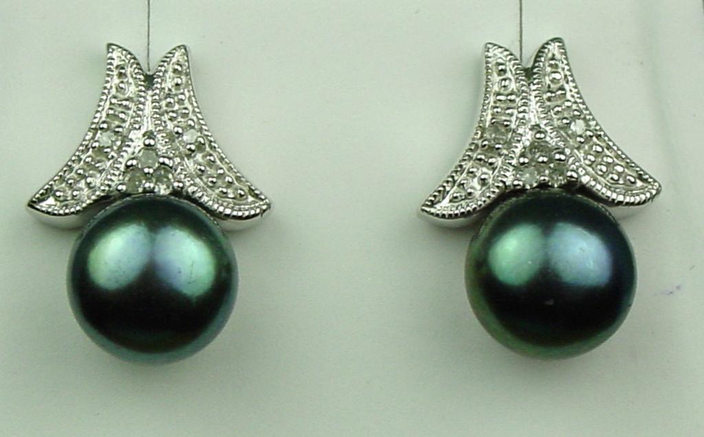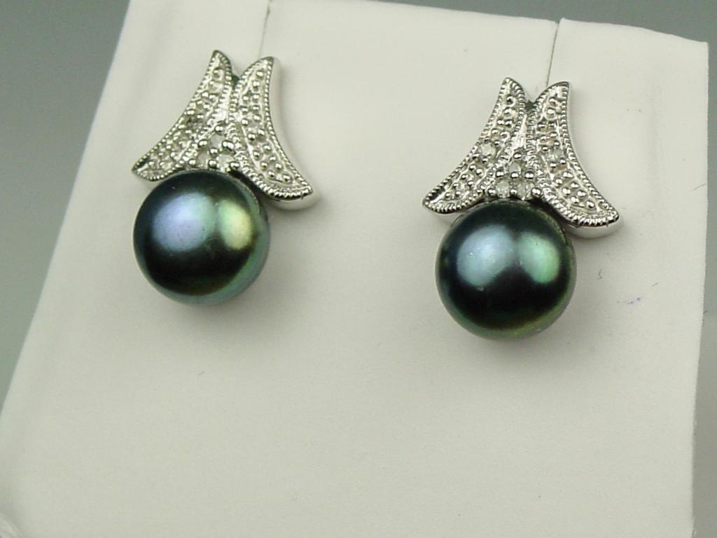 Brilliant 10 karat white gold ladies custom  design earrings set with two round black  Pearls averaging 8.00-8.50 mm in diameter and  pave set with 10 round diamonds of H-I  colors. Retail $1,450.00 Estimate $400-$700