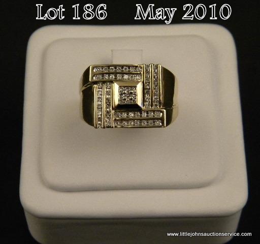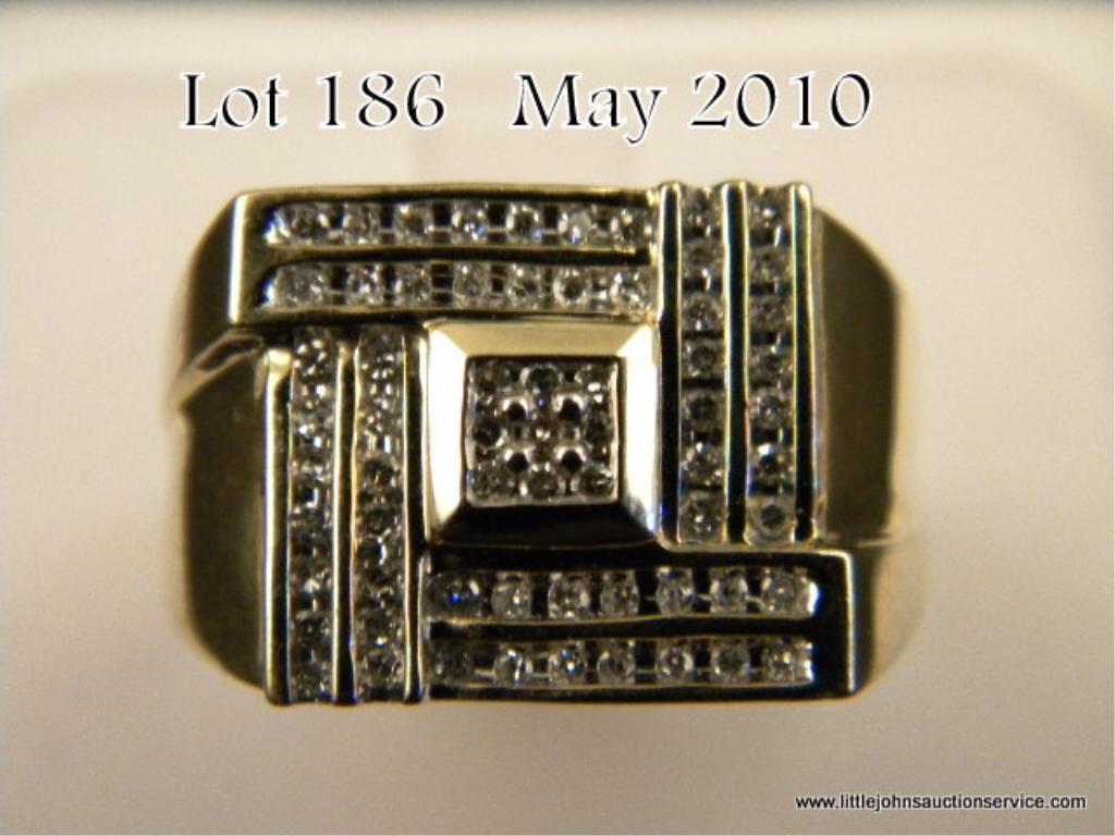 Brilliant 10 karat yellow gold gents geometric design ring set with 65 round diamonds weighing approx. 0.80 carats of G-H colors and SI clarity. Retail $1,450.00 Estimate $400-$800 A nice item