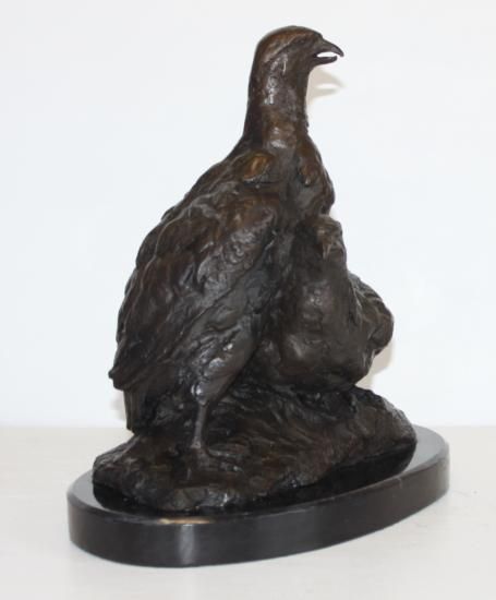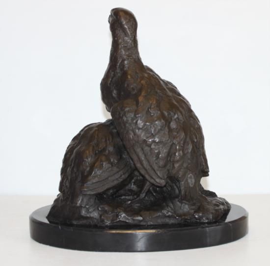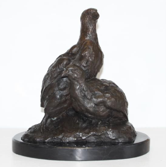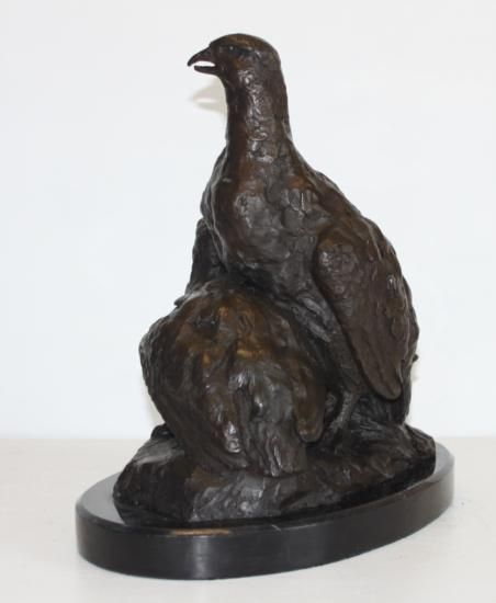 Partridges, Bronze Sculpture, After Barye, 12"L x 8"W x 12"H 20 lbs This bronze sculpture was produced using the "Lost Wax" casting method. The"Lost Wax" Cast method is the most precise metal casting technique in existence, ensuring exquisite detail of the original host model which is usually sculpted in clay or wax. This "Lost Wax" casting method is an extremely labor intensive and expensive process, but the end results produce a Heirloom Quality Masterpiece!