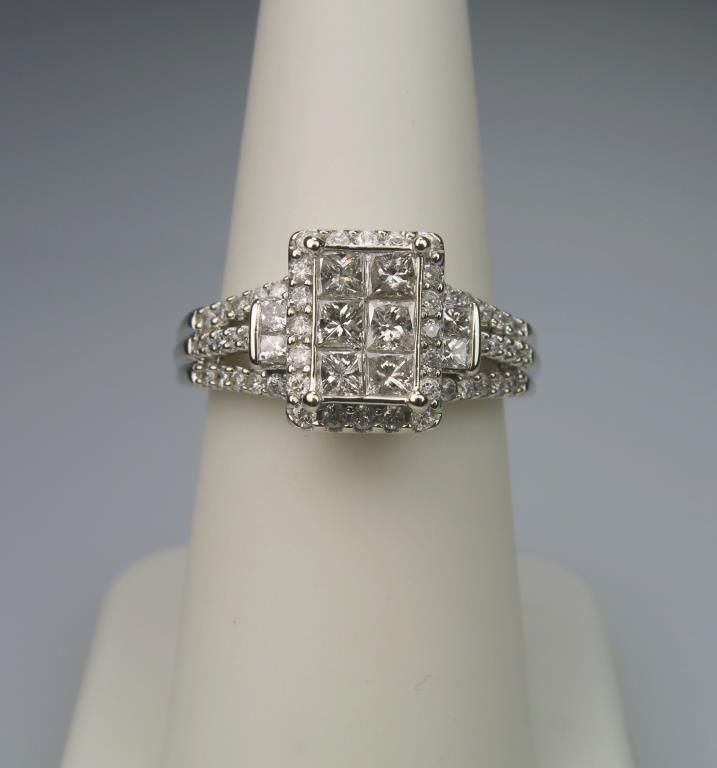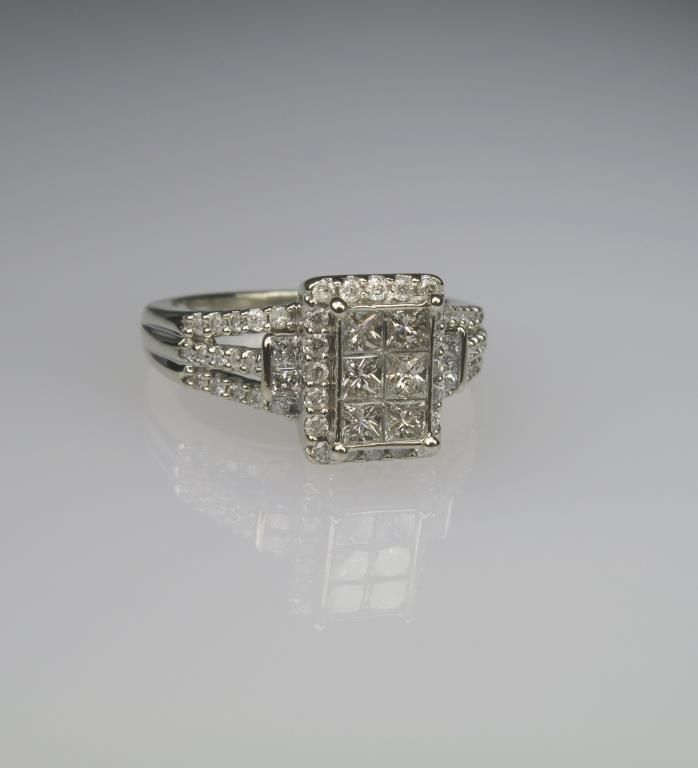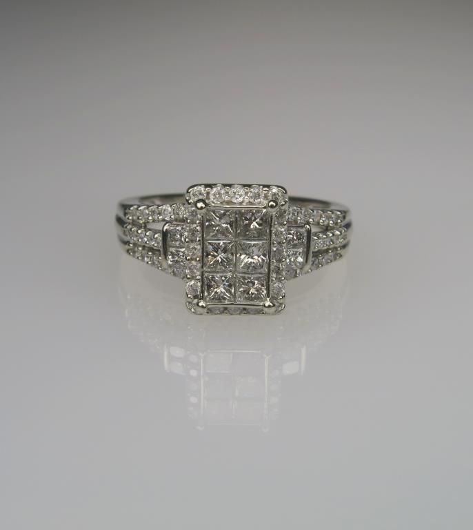 Brilliant Diamond Ring Fine set with 60 Princess and round cut Diamonds weighing approx. 1.50 carat total weight with F-G colors and SI clarity set in 10 karat white gold. Very Labor Intensive. Retail $2,400-$3,000 Estimate $1,500-$2,000.