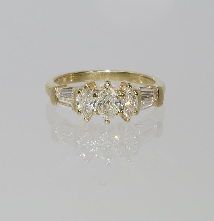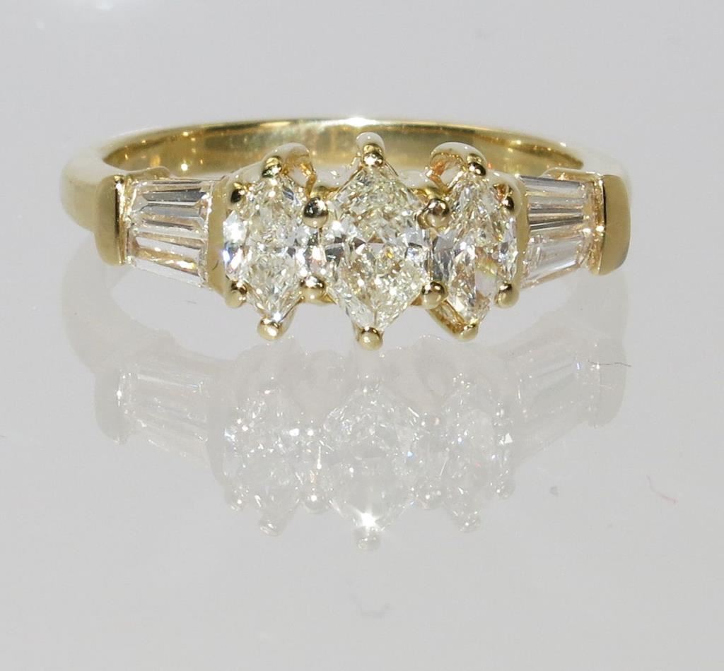 Features 3 marquise cut diamonds and 4 long tapered baguettes with G-H colors and VS/SI clarity total diamond weight approx 1.50 carats set in 14 karat yellow gold.
