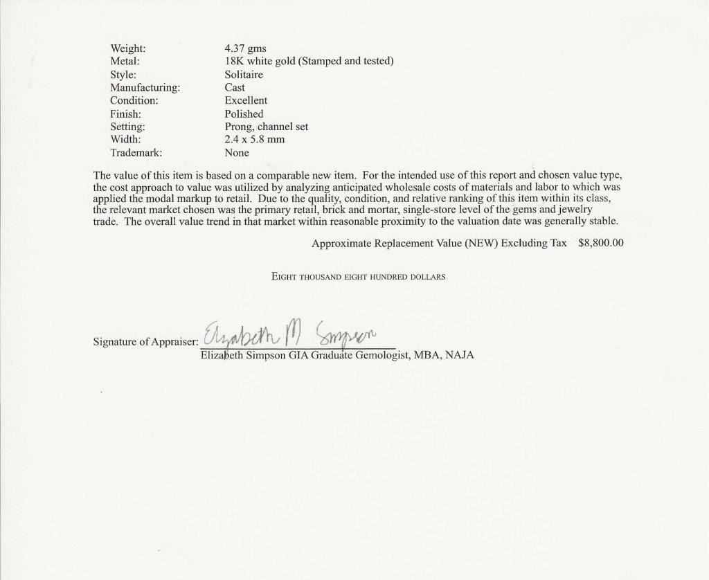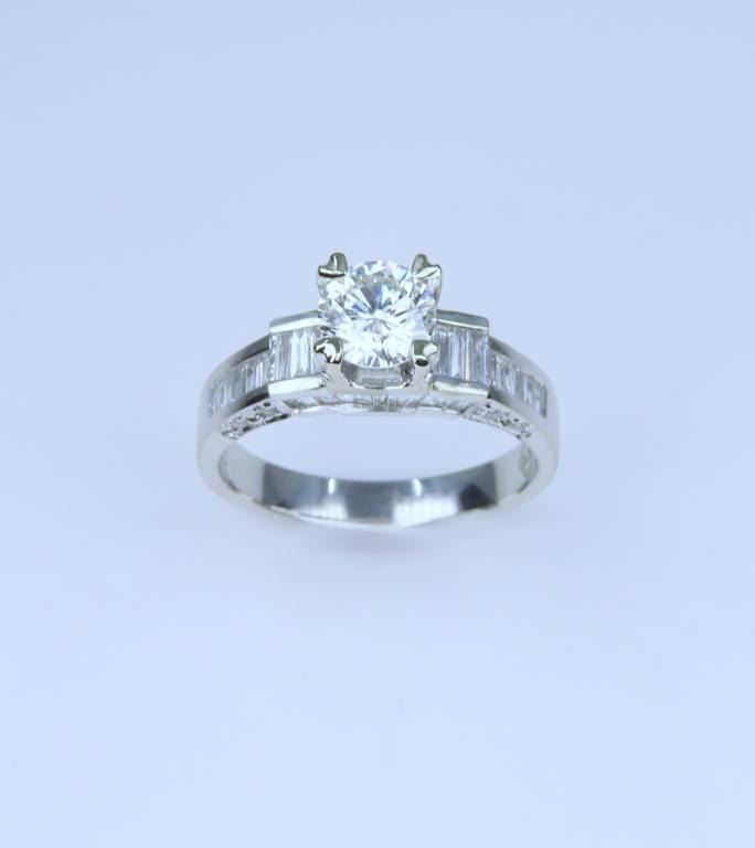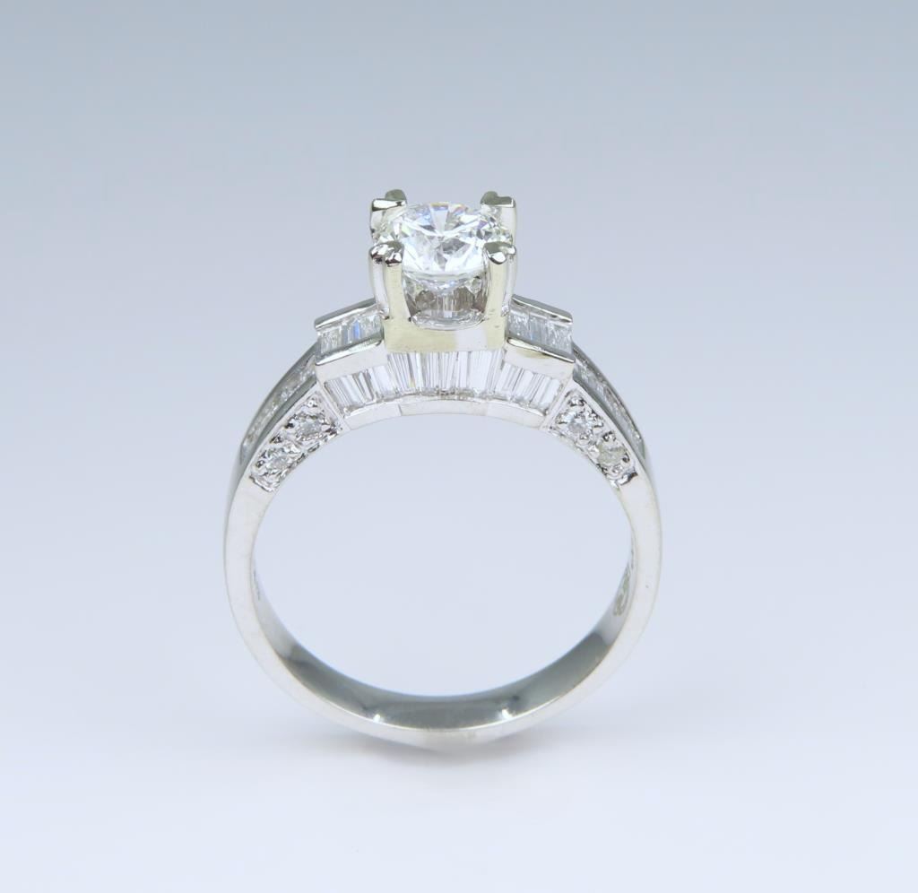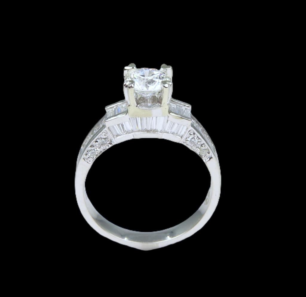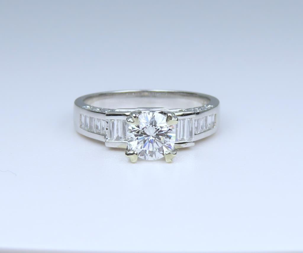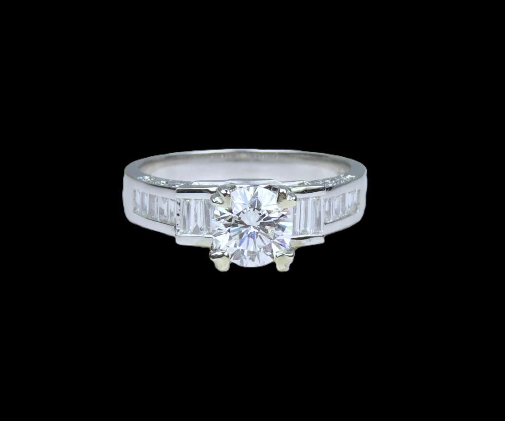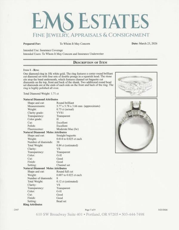 featuring a round cut 0.75 carat Diamond with H color and VVS1 clarity. Diamond is beautifully fine set with round and baguette cut accent Diamonds weighing approx. 1.00 carats with G-H colors and VS clarity set in an 18 karat white gold designer setting, ring size 5 3/4. Full Retail Appraised Value - $8,800.00.