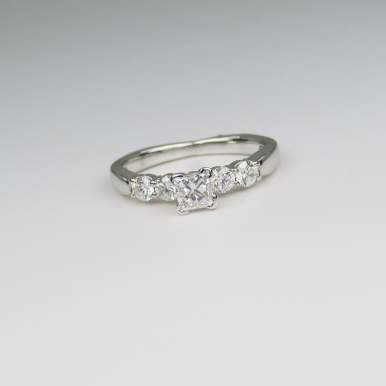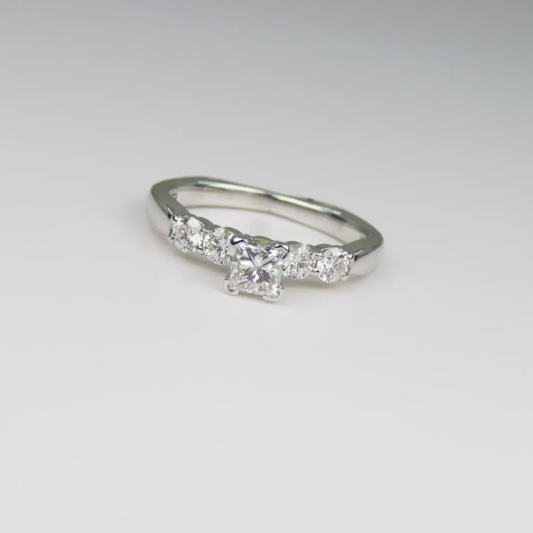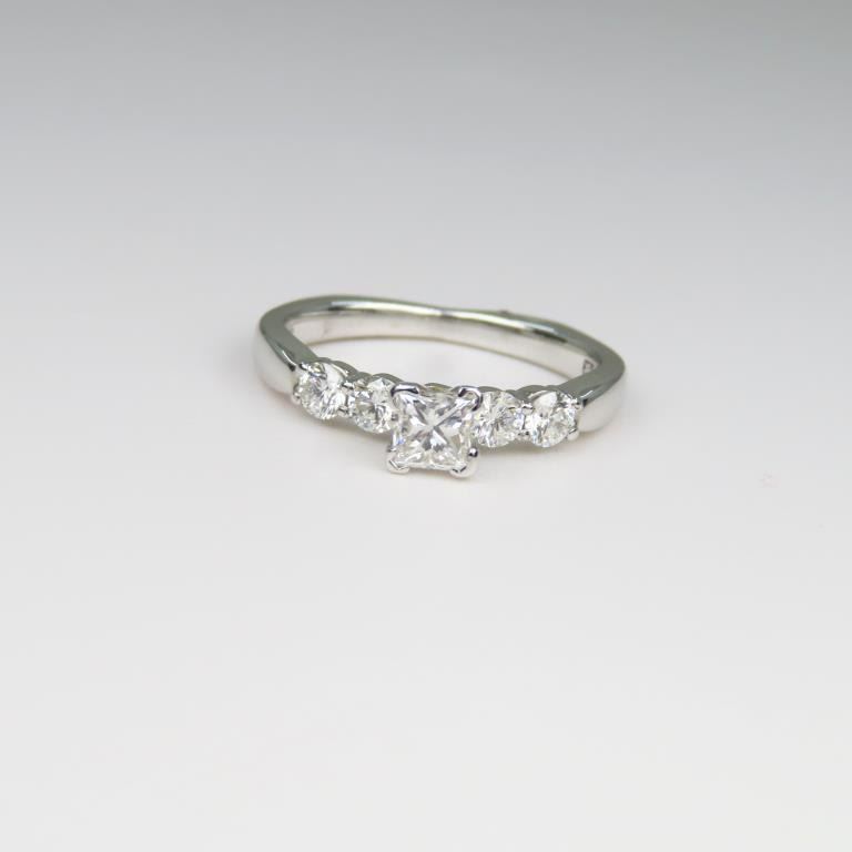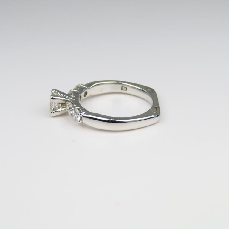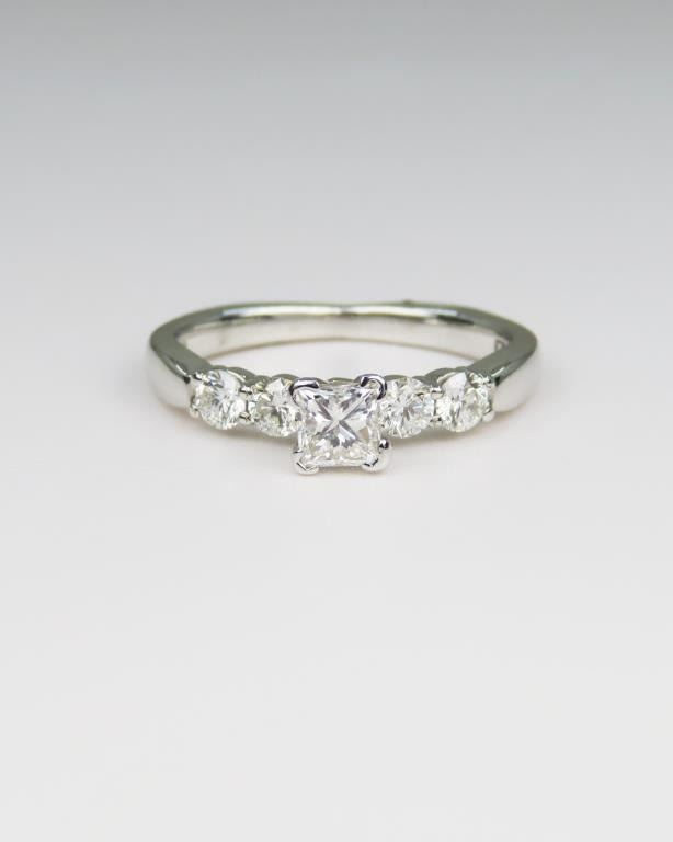 Ring featuring a Princess cut Diamond weighing 0.45 carats accented with 4 round cut Diamonds weighing approx. 0.55 carats all Diamonds have G-H colors and VVS/VS clarity combined Diamond weight 1.00 carat set in 18 karat white gold square shank setting signed and stamped with Hallmark. Retail $4,000-$5000