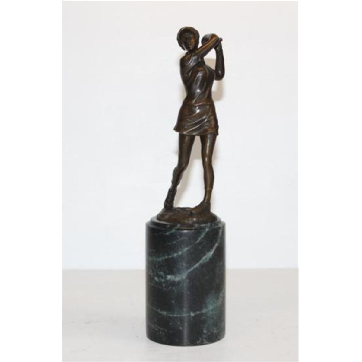 Brilliant Lady Golfer Swinging, Bronze Sculpture, After Milo 12"H x 4"W x 3 1/4"D 7 lbs. This bronze sculpture was produced using the Lost Wax casting method. The Lost Wax Cast method is the most precise metal casting technique in existence, ensuring exquisite detail of the original host model which is usually sculpted in clay or wax. This Lost Wax casting method is an extremely labor intensive and expensive process, but the end results produce a Heirloom Quality Masterpiece!