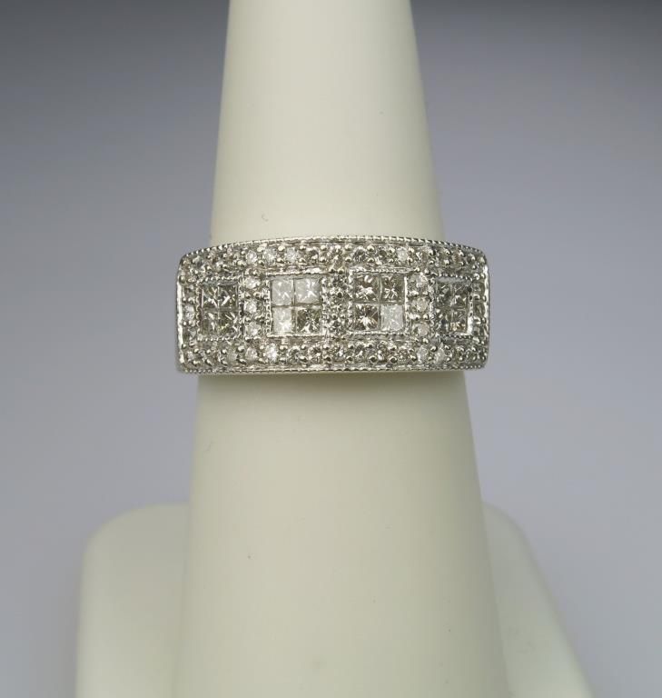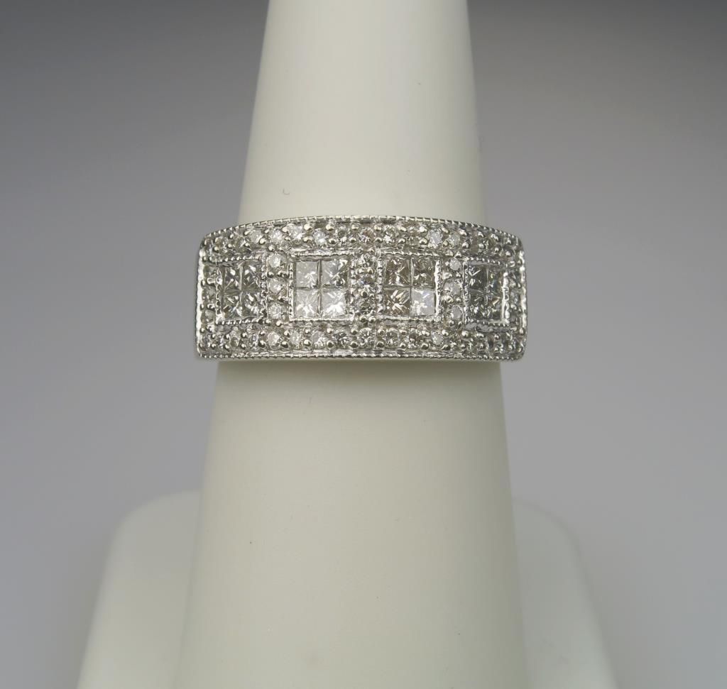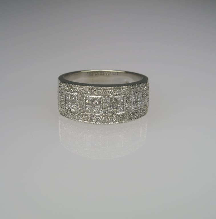 Brilliant Mosaic Patterned Diamond Ring with 65 Fine set Princess and round cut Diamonds weighing approx. 1.50 carats of G-H colors and VS clarity intricately set in 14 karat white gold. Very Labor Intensive. Retail $2,500-$3,000 Estimate$1,500-$2,000.