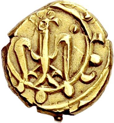 Brindisi. Federico II di Svevia, 1197-1250, imperatore dal 1220. Multiplo di tarí 1231-1250. AV 3,29g. Leggenda pseudo-cufica intorno a cerchio lineare; all’interno, aquila coronata ad ali spiegate volta a d. Rv. Lunga croce latina accostata da leggenda. Spahr 72. MEC 14, 532. Leggermente decentrato al dr., altrimenti Spl