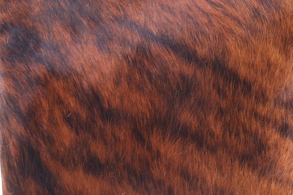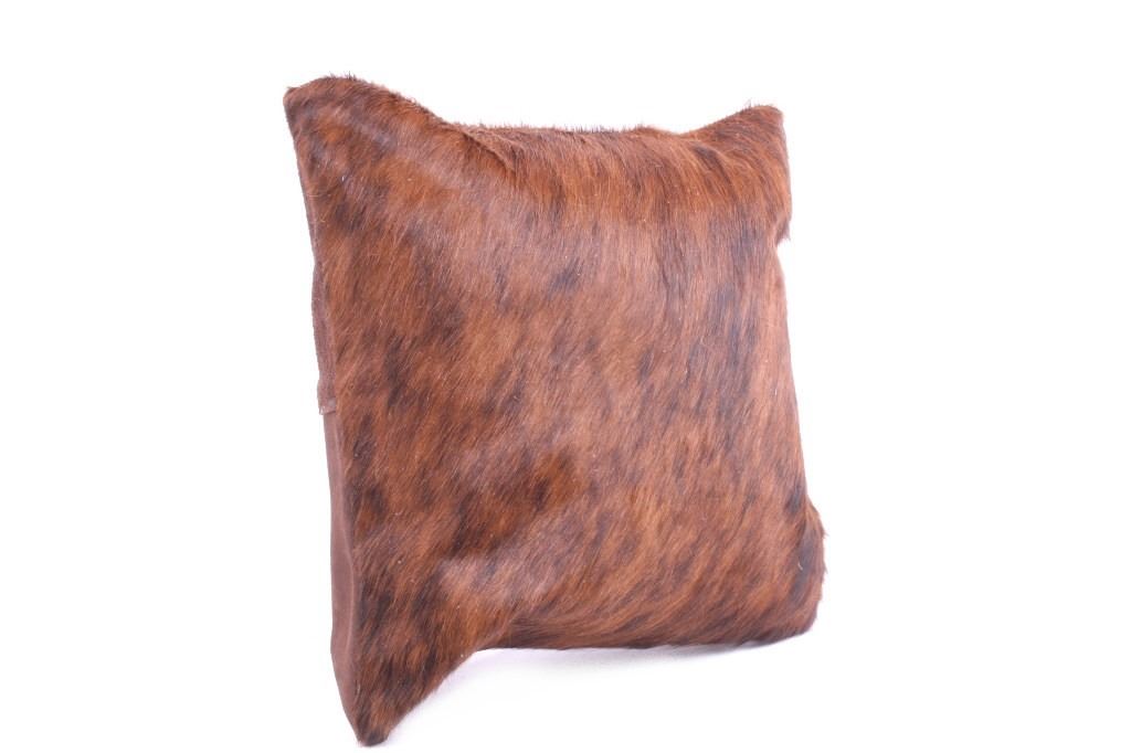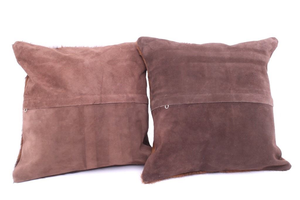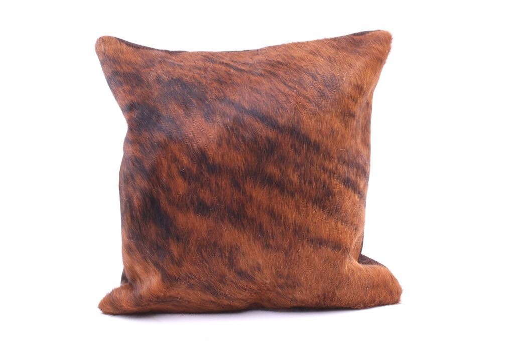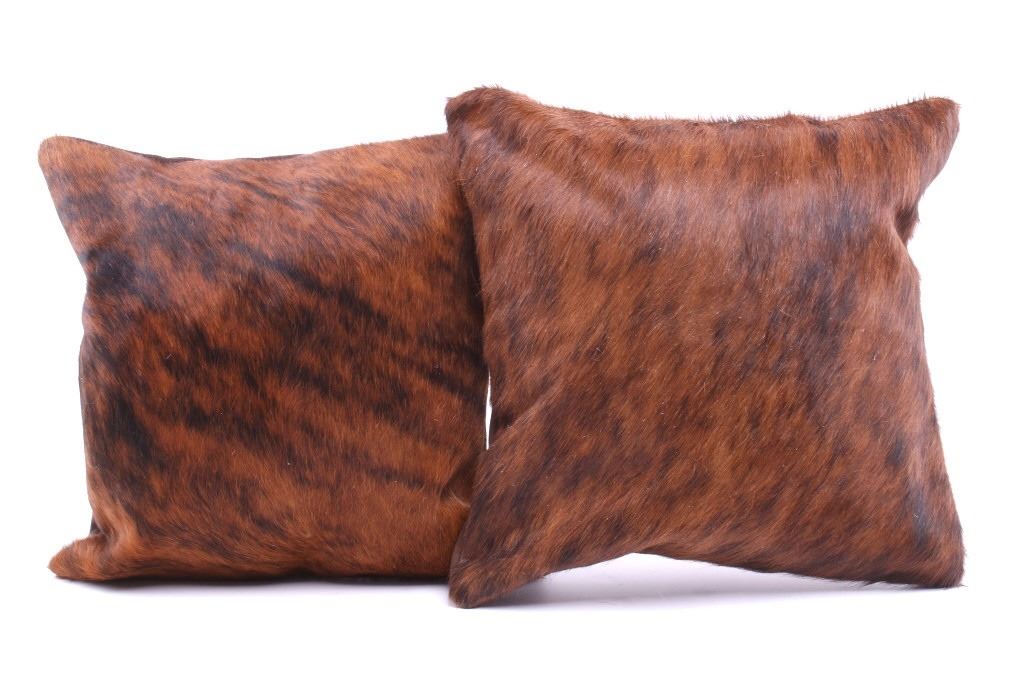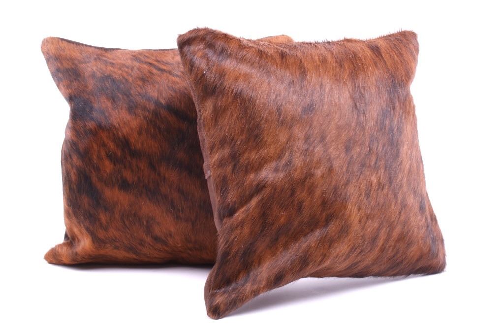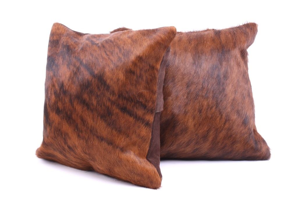 This is an excellent, premium cowhide set of two pillows with beautiful, natural brindle, brown and black coloring. The natural brindle design, with good texture, bold color, and iconic "Tiger Stripe/ Speckled" texturing that is traditionally seen with brindle colored cattle, gives a good contrast and a classic western touch to any room. The pillow shows a cowhide (also referred to as cow hide, steerhide, steer hide, bull hide, longhorn hide) front with natural hair and a tanned, matching black genuine leather backing, all being professionally tanned and in brand-new, pristine condition. The pillows each have solid metal zippers. The lot includes a matched set of pillows sold together for one price. Each pillow measures 15 7/8” by 15 7/8” (or 40x40xm measured flat without inserts). The pillows are photographed with pillow inserts, but are shipped and sold WITHOUT INSERTS.