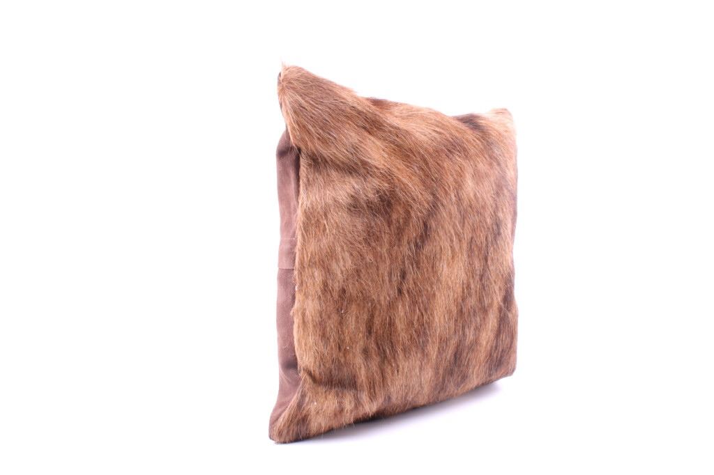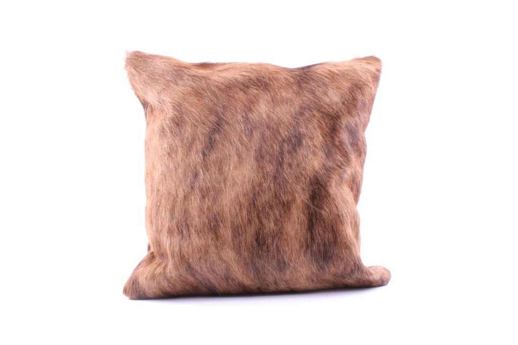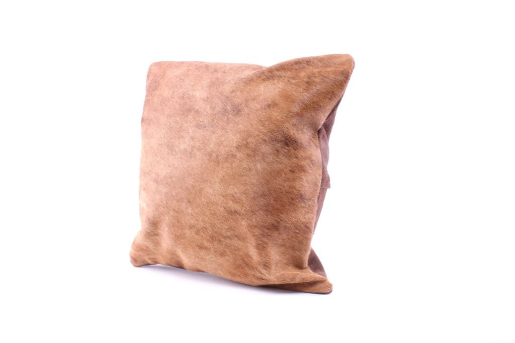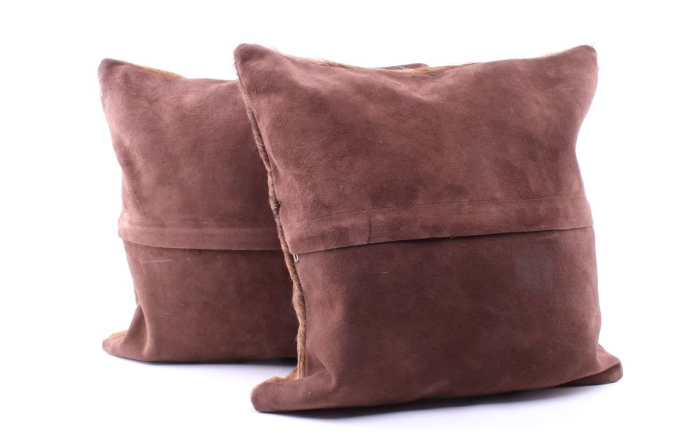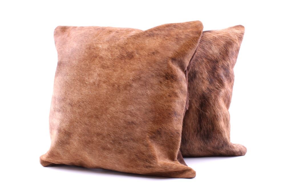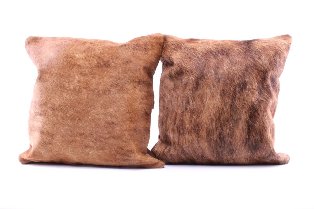 This is an excellent, premium cowhide set of two pillows with beautiful, natural brindle, light brown to brown coloring. The natural brindle design, with good texture, bold color, and iconic "Tiger Stripe/ Speckled" texturing that is traditionally seen with brindle colored cattle, provides excellent contrast and a classic western touch to any room. The pillow shows a cowhide (also referred to as cow hide, steerhide, steer hide, bull hide, longhorn hide) front with natural hair and tanned, matching black genuine leather backing, all being professionally tanned and in brand-new, pristine condition. The pillows each have solid metal zippers. The lot includes a matched set of pillows sold together for one price. Each pillow measures 15 7/8” by 15 7/8” (or 40x40xm measured flat without inserts). The pillows are photographed with pillow inserts, but are shipped and sold WITHOUT INSERTS.