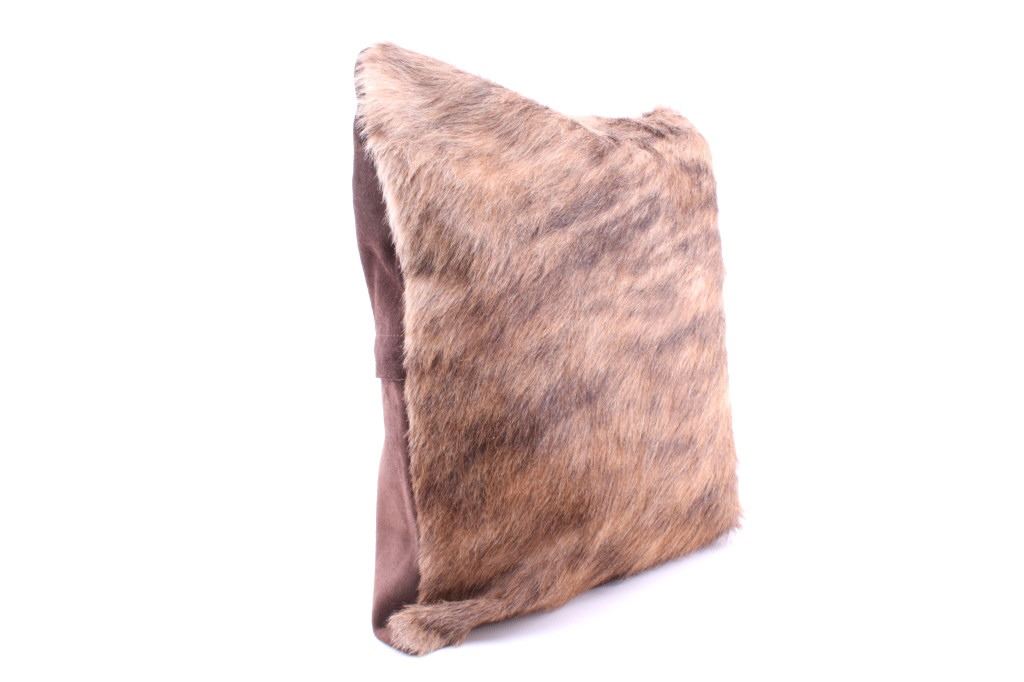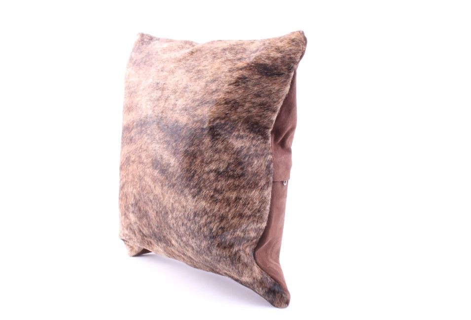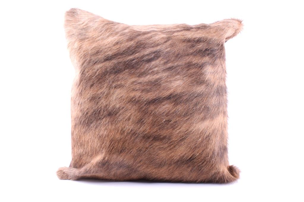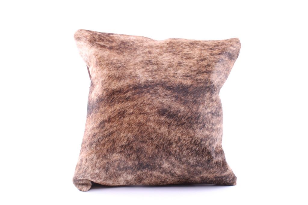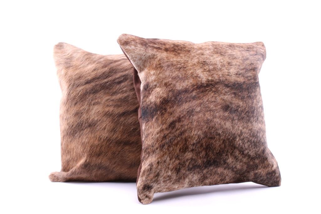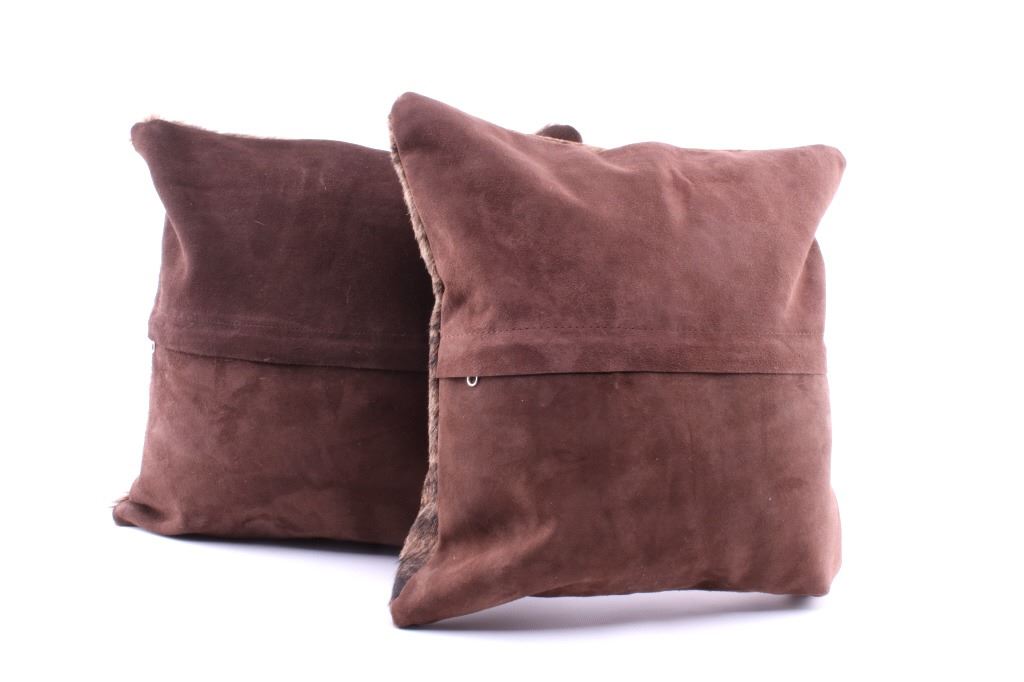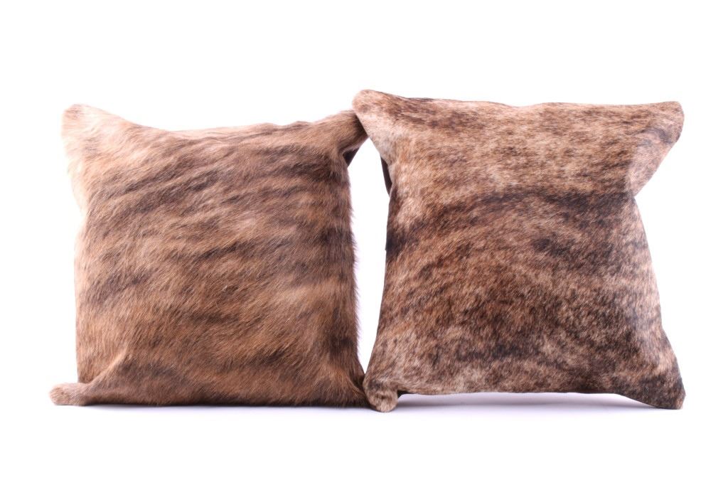 This is an excellent, premium cowhide set of two pillows with beautiful, natural brindle, light brown to brown coloring. The natural brindle design, with good texture, bold color, and iconic "Tiger Stripe/ Speckled" texturing that is traditionally seen with brindle colored cattle, provides excellent contrast and a classic western touch to any room. The pillow shows a cowhide (also referred to as cow hide, steerhide, steer hide, bull hide, longhorn hide) front with natural hair and tanned, matching black genuine leather backing, all being professionally tanned and in brand-new, pristine condition. The pillows each have solid metal zippers. The lot includes a matched set of pillows sold together for one price. Each pillow measures 15 7/8” by 15 7/8” (or 40x40xm measured flat without inserts). The pillows are photographed with pillow inserts, but are shipped and sold WITHOUT INSERTS.