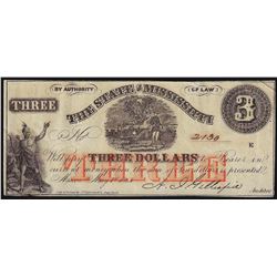 One 1864 $3 The State of Mississippi Obsolete Bank Note.
