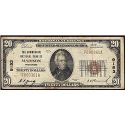 1929 $20 Madison Wisconsin National Currency Note CH# 9153