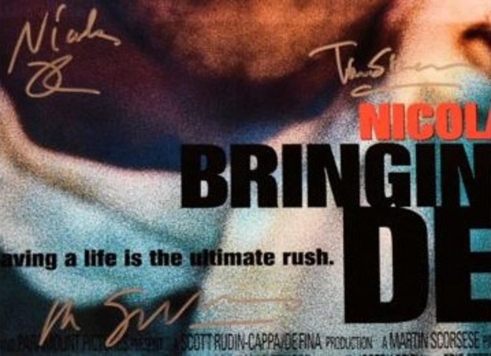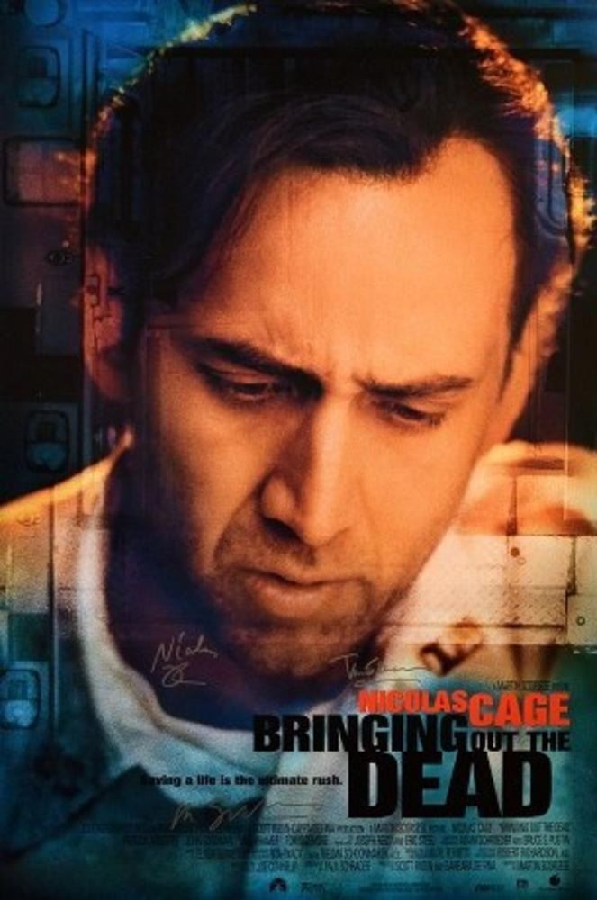 27 in. by 40 in. Promo poster for the movie "Bringing Out The Dead", autographed by Nicolas Cage, Tom Sizemore and Martin Scorsese.