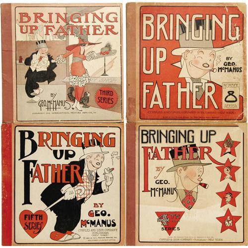 <B>Bringing Up Father #3-5 and 8 Group (Cupples & Leon, 1919-1925) Condition: Average GD.</B></I> George McManus art graces these Platinum Age books. Issues #3 (some brittle pages), 4, and 5 are GD; #8 is FR with brittle pages. Approximate Overstreet value for group = $100.<I>From the John McLaughlin Collection</B></I>. <BR><BR><B>Important notice:</B> Heritage usually auctions material at the rate of 200-250 lots per hour. On some occasions eBay Live bid software or the Internet may not be able to keep up with the pace of the auction. We recommend placing a realistic absentee bid now as insurance to avoid disappointment. Occasionally the auctioneer may eliminate or reject an eBay Live bid, and the auctioneer may also reopen a lot after the close of the eBay live bidding (usually because we missed an audience bid), and may reject your bid even if it shows you as the winning bidder. By bidding via eBay Live, you agree that Heritage may award the lot to another bidder at its sole discretion under the circumstances described above or any other reasonable circumstances. Since eBay bids are not shown to us until we open the lot on the floor, we treat those bids just like floor bids. In most cases the floor responds before the eBay bid is presented to us, due to Internet lag time, so for consistency we have made it a policy that floor bids are always considered first over tie eBay live bids. Also please note that all Heritage lots purchased through eBay Live carry a 22.5% Buyer's Premium. Please make sure you read the Terms and Conditions before you bid. This lot is being auctioned in conjunction with a live floor auction by Heritage Auction Galleries. All final auction and invoice information will be supplied by Heritage Auction Galleries, and all other information should be considered preliminary. Lot:50136 <BR><BR><B>Winning Notification and Billing:</B> After the FINAL session in this auction is complete, Heritage will send e-mail and snail mail invoices. This process normally takes several days. All final auction and invoice information will be supplied by Heritage Auction Galleries, and all other information should be considered preliminary. <BR><BR>This auction will be conducted on a live auction floor and over the Internet through eBay Live. If you choose to place an absentee bid, please take a moment to <font color='#0000ff'><u><a href='http://pages.ebay.com/liveauctions/help/before/laabsentee.html'>learn how eBay Live absentee bidding works</a></u></font><font color='#000000'>