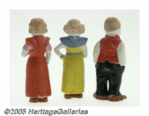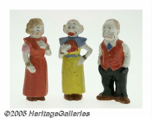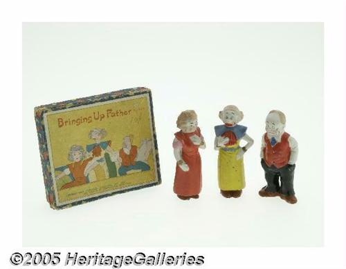 <B>Bringing Up Father Bisque Set with Box (George Borgfeldt Corporation, 1934).</B></I> Set of three bisque figurines of Maggie, Jiggs and Nora. Figures are 4" tall and in great condition. Made in Japan. <I>From the Larry Jacobs Collection.</B></I>