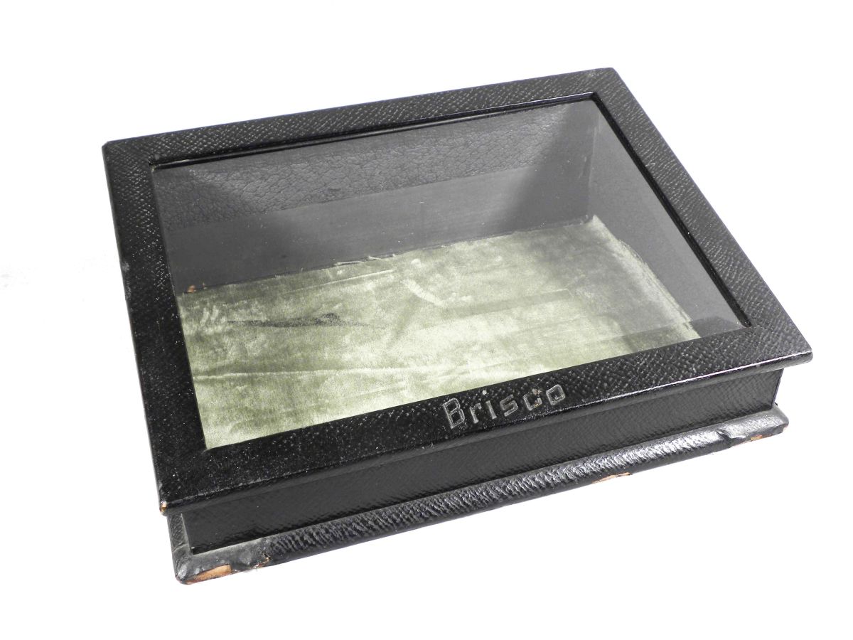 Brisco Display Case. Beveled glass top with leather covered wood. Minor Edge Ware damage on bottom front corners otherwise very good condition. 16 X 5 1/2 X 11 1/2 inches.