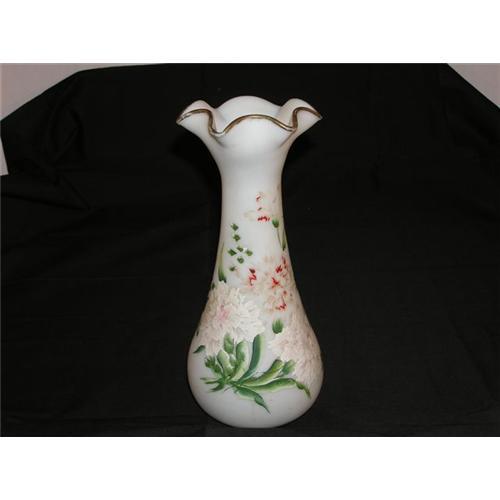 Ok where to begin- I know this is Bristol Glass- I am told it is late 1870s-80s- cannot confirm- it is handmade- milky white opaque- the gold leafing on the top ruffles is done in oil paint by hand- the body has an actual oil painted portrait- if you will - of beautiful white flowers- this is actual oil paint not a decal- not fired- it is smooth all over- some very slight wear because of its age- but the paint is perfect on not worn at all- you can feel its thick strokes- it sits on my desk so I can keep an eye on it- it is a piece to be admired