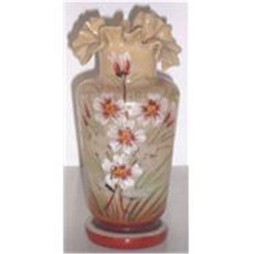 A lovely example of the art of Bristol Glass in this delicately ruffled rim vase with a pedestal foot. The glass is an opaque beige and the enamelled design is of wildflowers. The vase is in very good condition for such an old piece, and has only slight wear to some of the enamelled areas. The base bears the rough pontil characteristic of this type of Art Glass. The height is 7.5in and the base diameter is 2.5in.