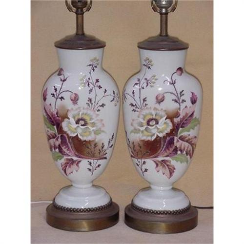 A posing pair of antique bristol glass vaes mounted as lamps, Vase is 14" tall, with base it is 18 1/2" to bottom of socket. Brass mounts make these hand painted glass vases a beautiful addition to any room. Condition of vases is excellent, brass mounts could be cleaned or polished, may need rewiring.
