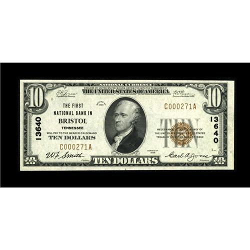 <B>Bristol, TN</B></I> - $10 1929 Ty. 1 <B>The First NB</B></I> Ch. # 13640<BR>Just two notes in the census from here are listed as uncirculated. Make that three, as this piece is likely as nice as any, with bold original embossing and bright white paper. <B>Gem Crisp Uncirculated.</B></I><BR><BR><b>Shipping:</b> Coin/Currency (<a target="_blank" href="http://www.heritageauctions.com/common/shipping.php">view shipping information</a>)