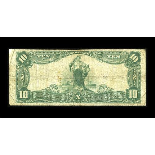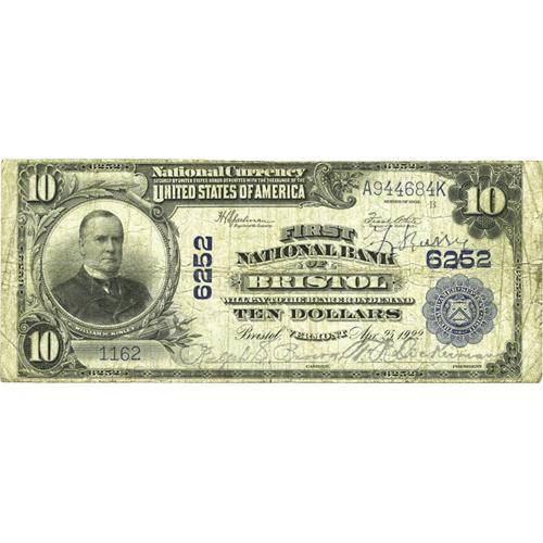 <B>Bristol, VT</B></I> - $10 1902 Plain Back Fr. 635 <B>The First NB</B></I> Ch. # 6252<BR>A somewhat soiled <B>Fine</B></I> from the only issuer located here. Just two large notes are listed in the census, a $10 Plain Back reported without serial number or grade opinion, as well as a $20 of the same design type. As of 1935 just $860 of this bank's issue remained in the hands of the public. This is a so-called "Fourth Charter" note, bearing a 1922 plate date. While we can't be certain whether this is the note already listed in the census or a new addition, it is certainly from both an excessively elusive bank and an especially scarce denomination and type within the overall emissions of the institution. Our estimate may prove to be conservative.