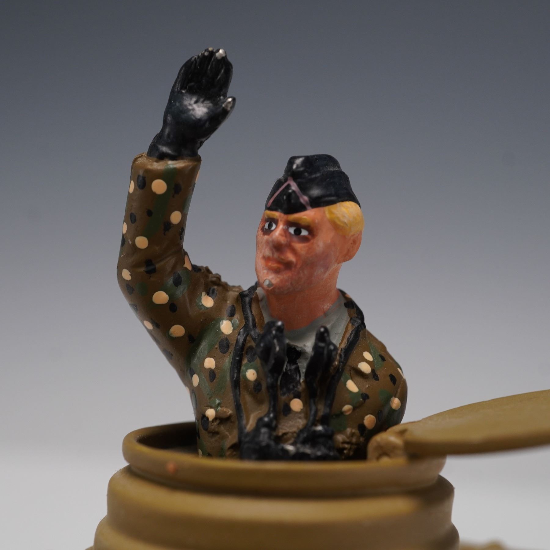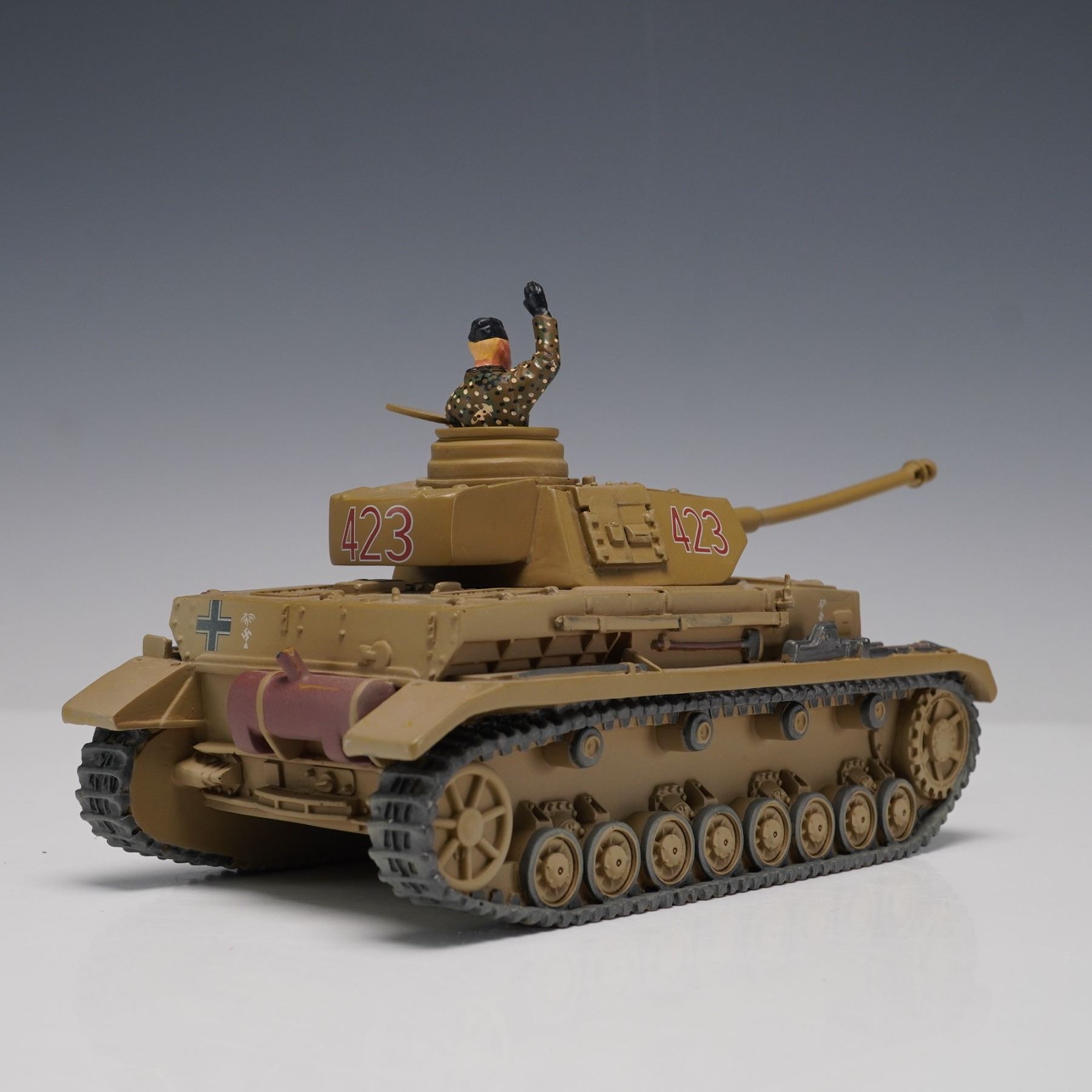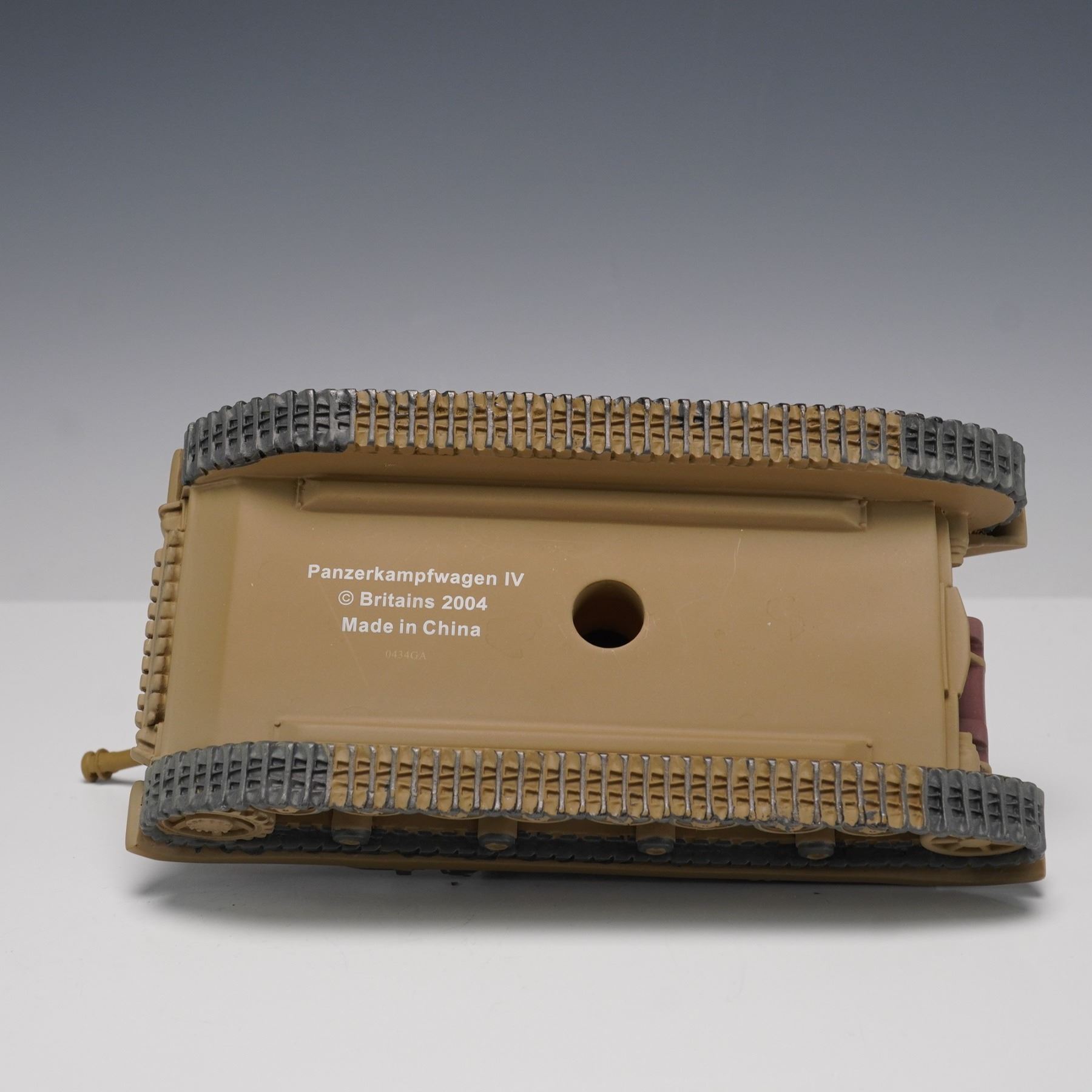 Britains die-cast military model, Panzerkampfwagen IV, dated 2004. This detailed replica features desert camouflage finish, molded track treads, and a rotating turret with removable tank commander figure. Marked on the underside with model information and made in China. An excellent addition for military collectors or historical diorama display.