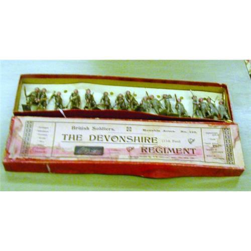 Box of 16 Britains british soldiers - The Devonshire Regiment (11th foot). Box has water damage. Some paint loss and few missing pieces - most have moveable arms. Great for collectors. Buyer pays shipping and handling costs.