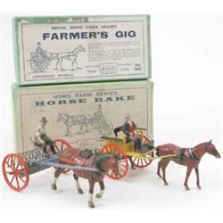 Britains farm vehicles, pre-war, No. 8F Horse Rake and 20F Farmer's Gig, each with operator, very good, in original boxes, boxes good £80-120