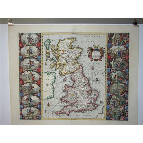 415 X 525 copperplate. Coloured. A splendid example of one of the most sought-after cartographic depictions of Britain illustrating Anglo-Saxon history in flamboyant Dutch style. Based on Speed?s map of 1611 the map differs from a very similar copy by Blaeu, Jansson?s chief rival, by the addition of rhumb lines in the sea areas. The map is marked with the seven ancient kingdoms of Britain over twelve hundred years ago. At each side vignette illustrations and scenes of the kings and historical events are given. Jan Jansson?s map appeared in his British county atlas and subsequently in the atlas of classical and historical maps by Georg Horn that was re-issued throughout the century. This example lacks verso text. This is another one very rare map, and a very hot collectible one. Museum quality and we only have it for 30 days, so if interested, please e-mail for more info or photos, as we have several. The collector we are selling for is moving out of state, and has buyers already on them. I have sold several for him, so he is letting me run a few more for him. They are very old and in great condition, as he knows how to take care of beautiful pieces of art like them. He knew what to buy, and when they came available, he bought. Now now enjoying all he has, he is selling some of his prize collection, and we have it. So serious buyers ...