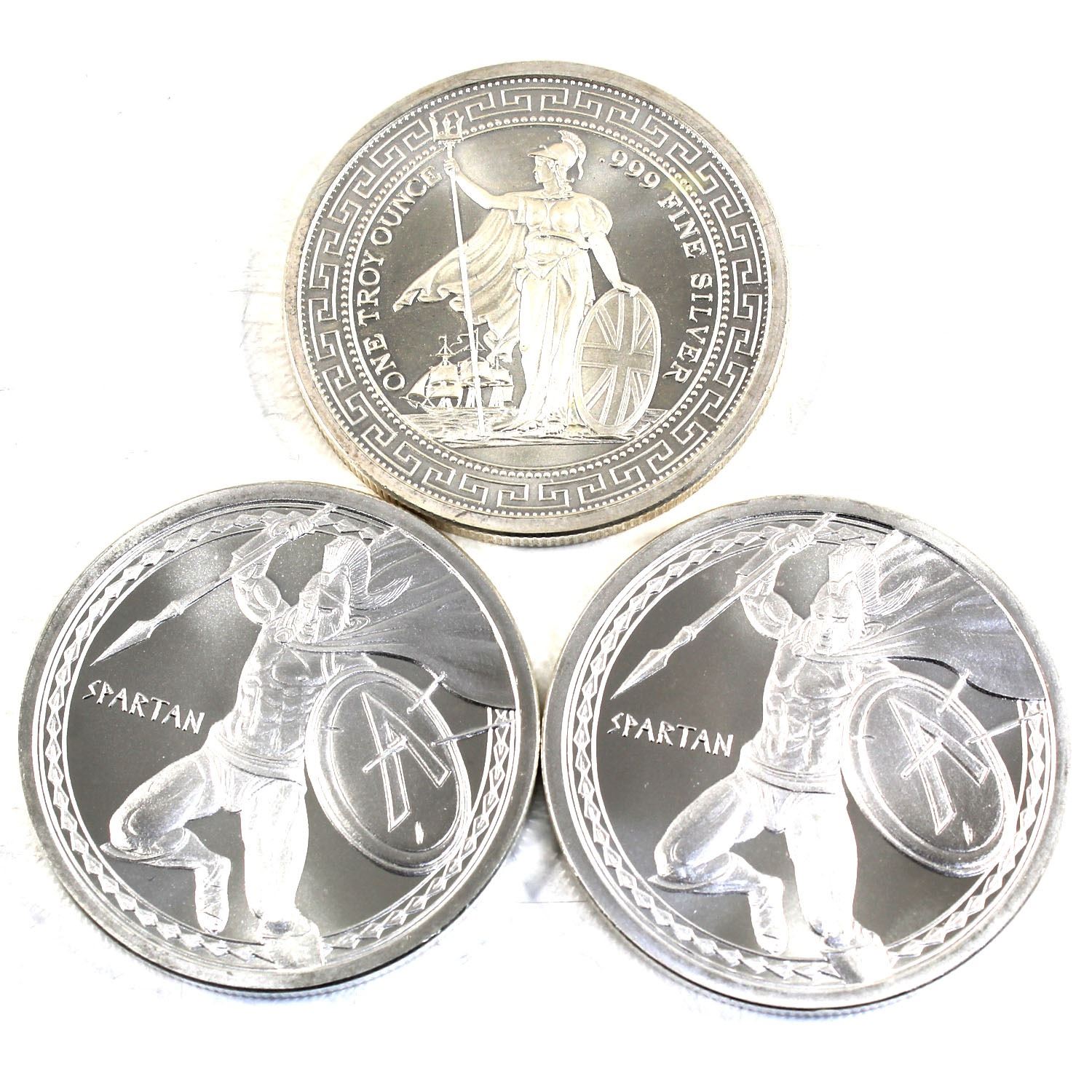 Britannia Design with Oriental Border & 2x Spartan Warrior 1oz .999 Fine Silver Rounds. 3pcs (TAX Exempt)