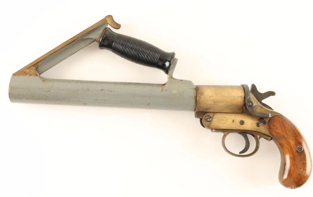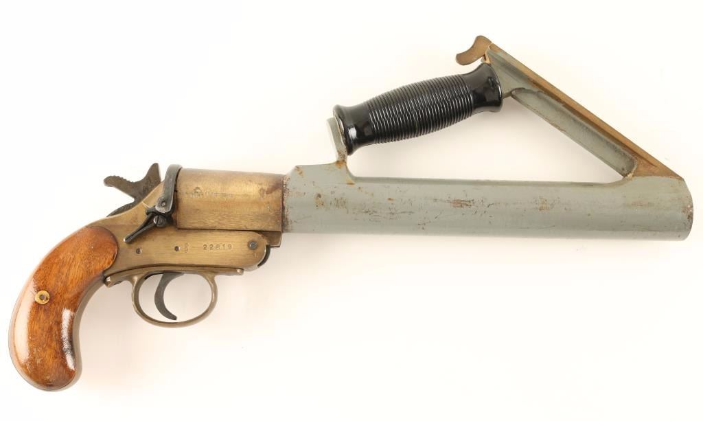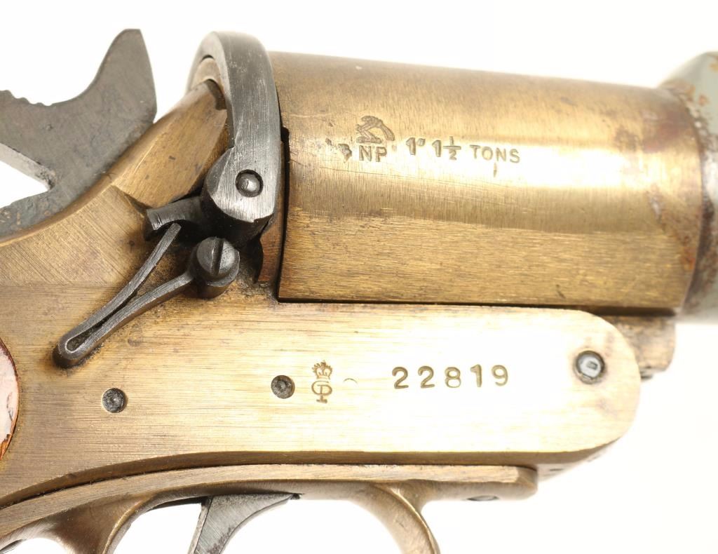 WWII Schermuly pistol with wood grips, brass receiver and barrel with plastic upper grip. Maker marked with logo and '1" 1 1/2 Tons' and '22819'.