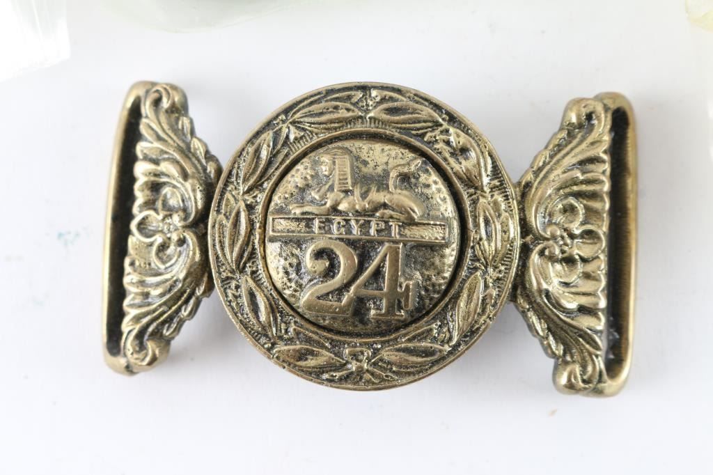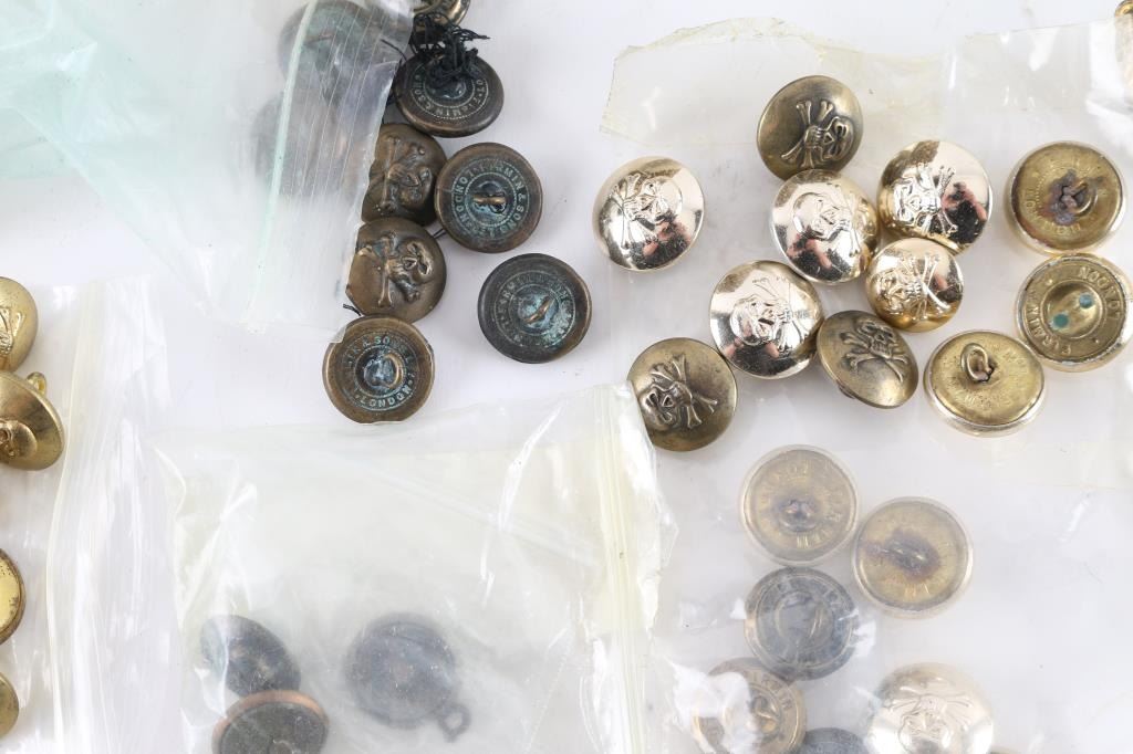 A great example of a stamped brass 17th Lancers Shako badge showing battle honors for Alma, Inkerman, Sevastapol, Balaclava, Central India, and South Africa. With the motto “Death Or Glory” incorporating the deaths head skull. The regiment was raised in 1759 and notable for its participation in the Charge of the Light Brigade during the Crimean War. Screw on type with looped nuts on rear. Excellent condition. Bag with about 100 brass 17th Lancer brass buttons, Different sizes, all English maker marked, All have the skull & crossbones. Two contemporary 17/21 Lancer cap badges, skull & crossbones with "Or Death". Four Lions head helmet bosses. Bag of Skull/crossbones, unmarked, contemporary, bag containing silver toned skull/crossbones button, English maker marked . Vintage 17th lancers skull/crossbones buttons, nice patina. Framed regimental cap badge, skull & Crossbones. Vintage CDV of British lancer in full dress uniform. , from Glasgow studio. From the Joe Musso Collection.