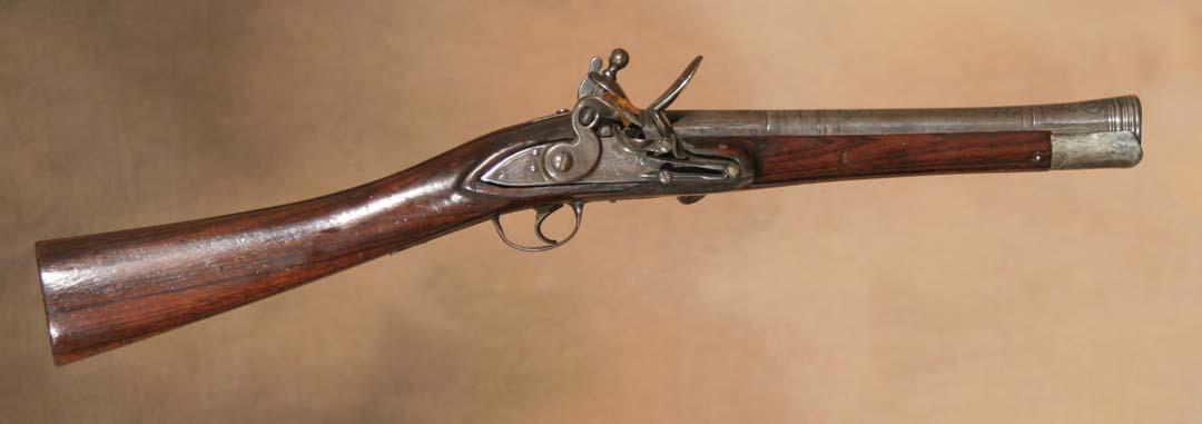 Flintlock Blunderbuss. 11" barrel, 23" overall. 56 calibre, British proof mark. Circa 1811. (est $1,800-2,200). For condition reports please visit: www.auctioninsantafe.com/cr2011.pdf