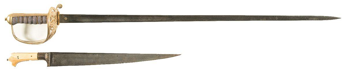 1) British Officer's Hawkes & Co (London) Pattern 1822 Sword with 32" etched single fuller blade with gold Proved stamp, wire wrapped rayskin grip and gild guard with George V cipher. Good, with a dark patina forming on the blade and minor hilt wear. 2) Afgan Kyber knife with 15" single edge blade, flat spine, gilt accented hilt and smooth bone grips. Fine condition, with dark metal, 80% original gold and some light cracks on the grips.