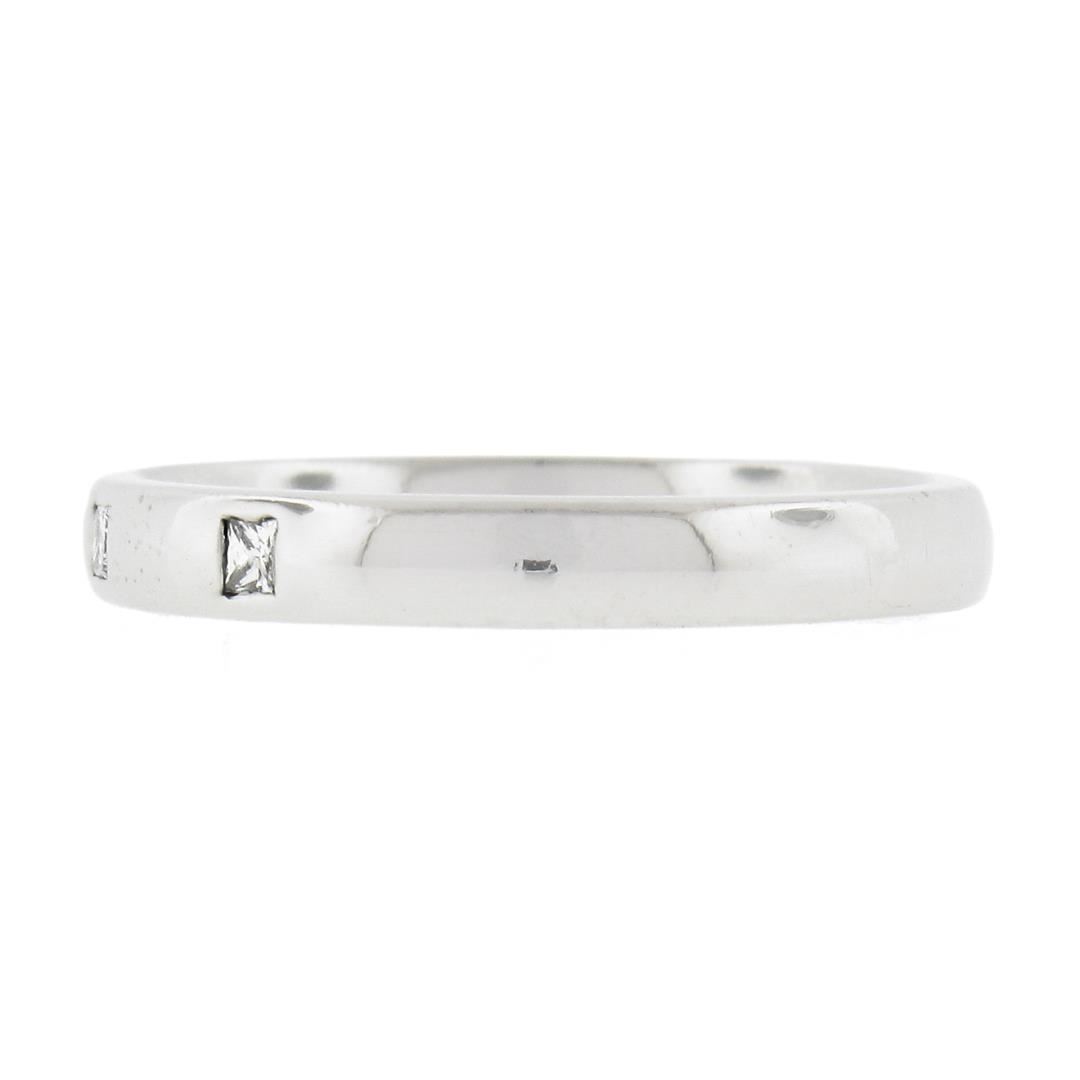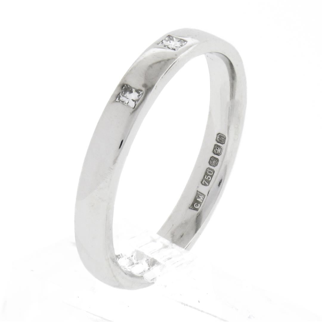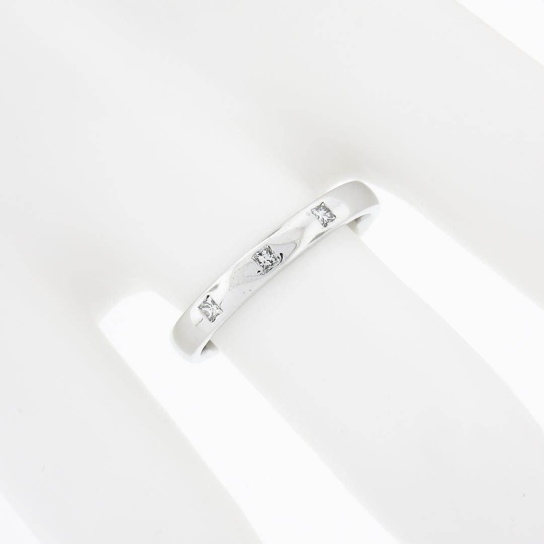 A solid 18k white gold british band ring, with 3 princess cut natural diamonds (H/I - VS2/SI1 ; 0.05ctw). The ring is size 6.0, weighs a total of 3.10 grams, and measures 2.7mm wide.