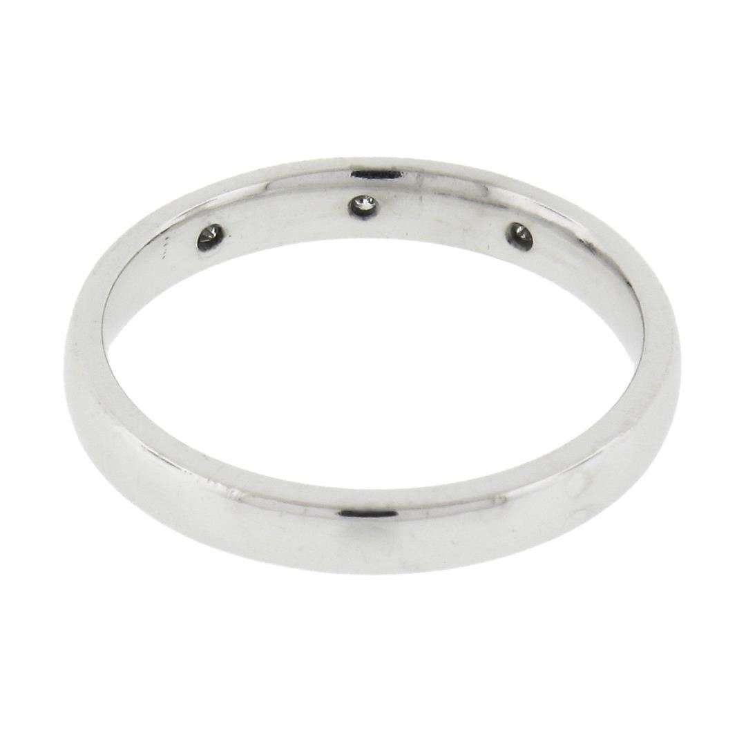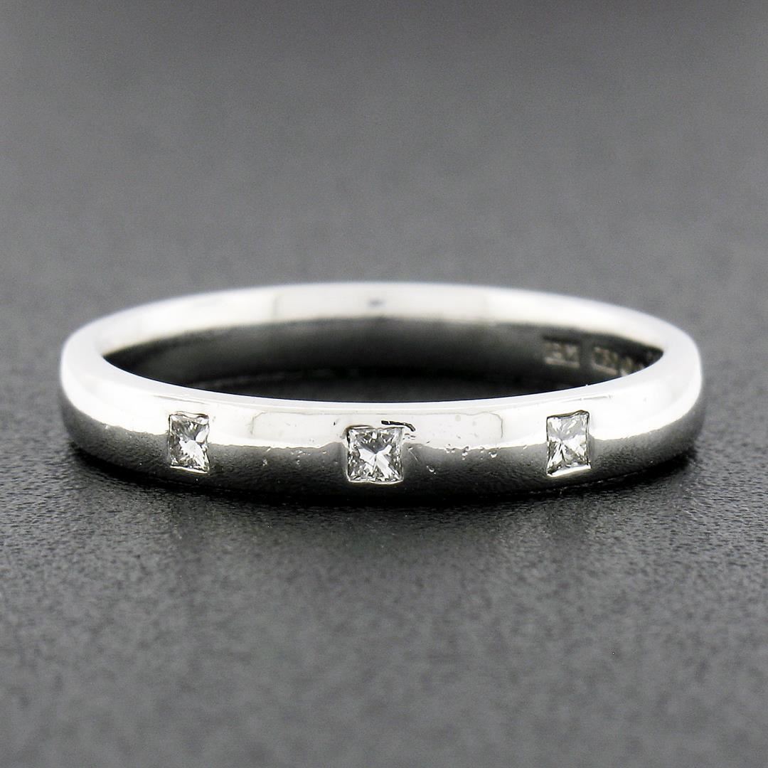 A solid 18k white gold british band ring, with 3 princess cut natural diamonds (H/I - VS2/SI1 ; 0.05ctw). The ring is size 6.0, weighs a total of 3.10 grams, and measures 2.7mm wide.