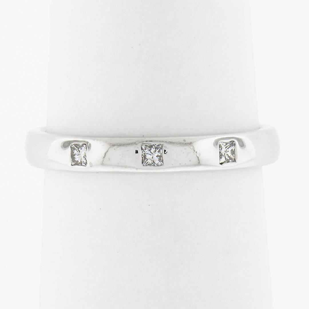 British 18k White Gold .05 ctw Flush Set Princess Diamond Three 3 Stone Band Rin