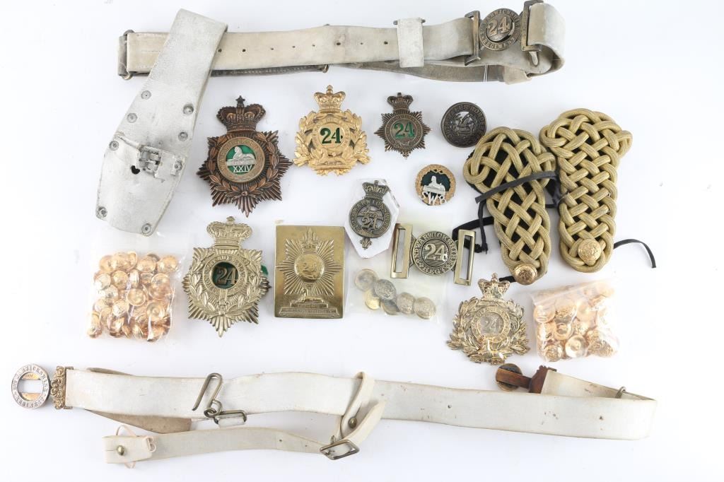 The 24th Regiment of Foot (2nd Warwickshire) has a very distinguished military career, Egypt. Zulu Wars, Boar war, WW1, WW2 etc. This lot includes 1) Pair of officer gold braid epaulets with brass "24" surrounded by wreath buttons. 3) Stamped brass with cut out 24 Regiment helmet plate, crowned wreath with Sphinx, and "Egypt". 4) Larger Helmet plate, crowned wreath with round "Warwickshire" center plate Sphinx with Egypt", and "XXIV" in the middle. 5) Stamped brass cap badge, crowned wreath with cut out "24".5) Round cap badge with Dragon, and "South Wales Borderers" 6) Six vintage brass buttons with wreath, and "24", all maker marked. 7) Vintage White leather belt with sword hangers, staple brass belt buckle, with "2nd Warwickshire regiment Regiment" on the outside. "24' over crown on the inside. 8) Two '24" brass stable belt buckles. 9) Two cap badges. 10) Brass 24th cross belt plate. 11) 2 bags of brass 24th buttons, unmarked, newer, possibly movie props. 12) White leather dress belt with brass 24th stable buckle, and bayonet frog. 13) Stamped brass helmet plate. All in very good condition. From the Joe Musso collection.
