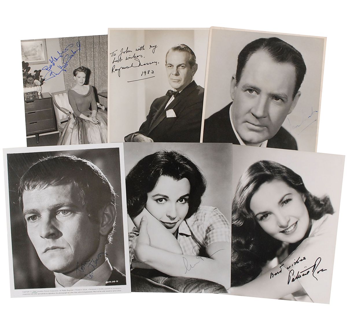 Six glossy photos of British actors and actresses, approximately 8 x 10, each signed in ink by the subject. Signers are: Ian Hunter, Tom Courtenay, Raymond Massey (ins), Claire Bloom, Patricia Roc, and Phyllis Calvert. In overall fine condition.